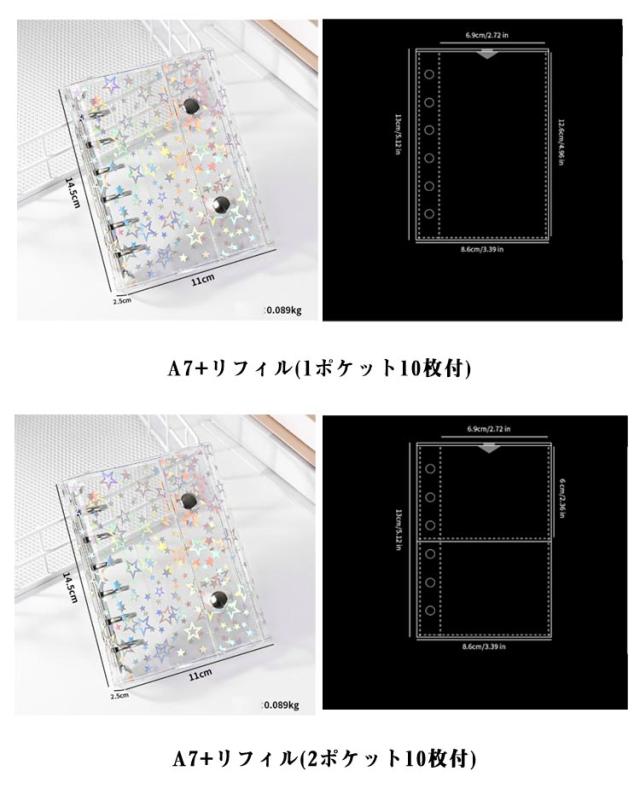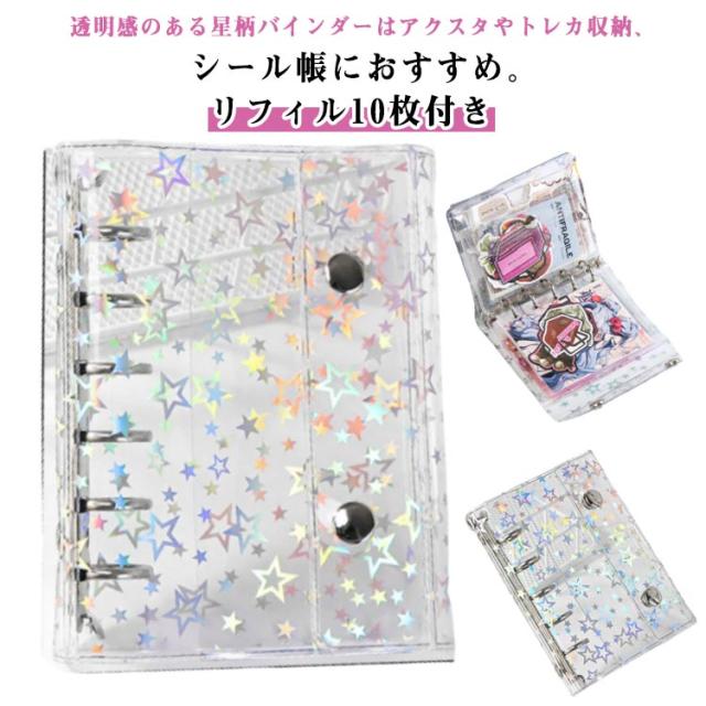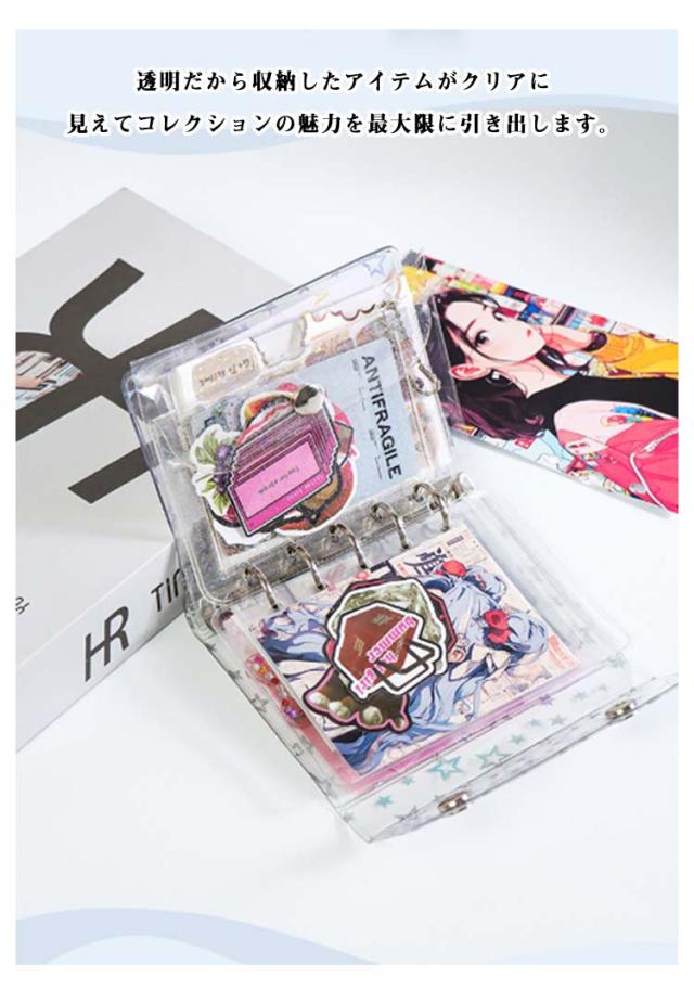 | 透明感のある星柄バインダーはアクスタやトレカ収納、帳におすすめ。【リフィル10枚付き】 クリア素材の手帳で、自分だけのオリジナルデコレーションが楽しめます。 リフィルが20枚付属。リフィルにはトレカや、チェキ、 チケットなども入れられて便利。 透明だから収納したアイテムがクリアに見えてコレクションの魅力を最大限に引き出します。 選べるM5とA7の2サイズで、持ち運びラクラク。小さなバッグにもすっぽり入るから、通学やお出かけのお供にもぴったり。 | |