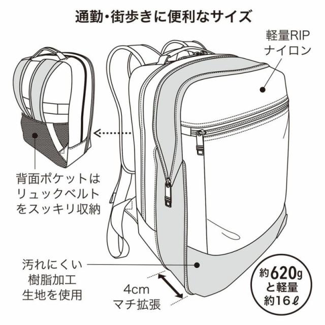横27cm×縦39cm×マチ3+11cm 重さ:約0.6kg 容量:約16L 素材:210Dリップナイロン撥水加工 メインルーム:オープンポケット中(伸縮メッシュ)x2、PCポケット(クッション材入り) 前面ファスナールーム:オープンポケットx2 背面:キャリーループ、リュックベルト収納ポケット カラー:Black |