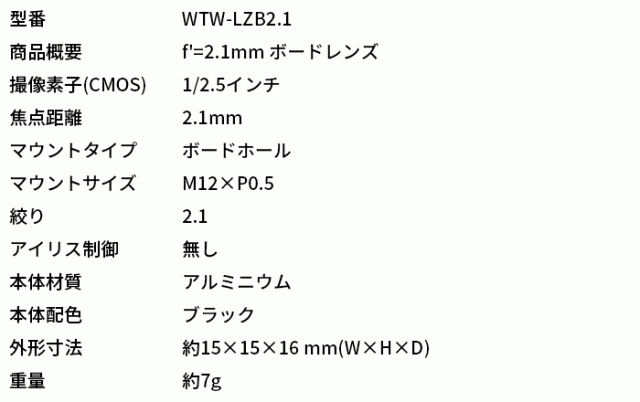 ■ WTW-LZB2.1 | f'=2.1mm ボードレンズ【防犯カメラ】【監視カメラ】【セキュリティーカメラ】【小型カメラ】【塚本無線】