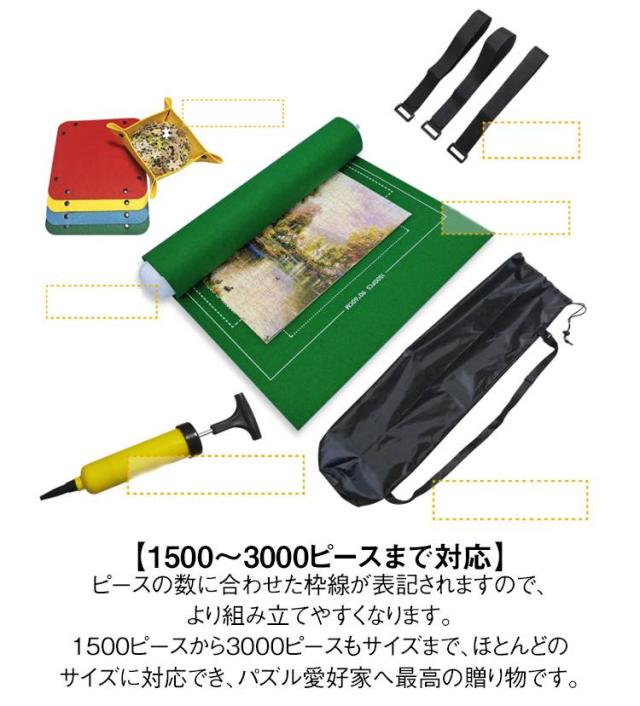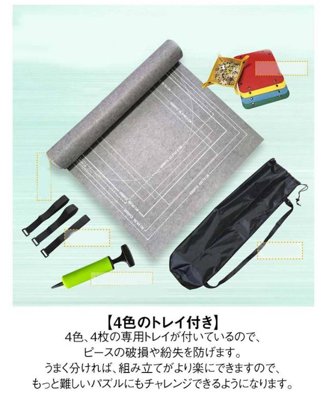 | 【セット内容】 マットx1・空気入れx1・収納袋x1・ゴムベルトx3・エアチューブをx1・トレーx4。便利なセット商品になります。パズル愛好家はもちろん、初心者でも一枚あれば組み立てやすくなりますので、もっと楽しめます。パッケージにはパズルは含まれないことをご注意ください。 【使いやすい 】 組み立て途中のパズルをマットの上にを広げ、 膨張したチューブをマットの端に置いて、均等な圧力で巻き付けます。ゴムバンドでしっかりと固定し、専用袋に入れて保管しましょう。 【1500〜3000ピースまで対応】 ピースの数に合わせた枠線が表記されますので、より組み立てやすくなります。1500ピースから3000ピースもサイズまで、ほとんどのサイズに対応でき、パズル愛好家へ最高の贈り物です。 【4色のトレイ付き】 4色、4枚の専用トレイが付いているので、ピースの破損や紛失を防げます。うまく分ければ、組み立てがより楽にできますので、もっと難しいパズルにもチャレンジできるようになります。 【使用便利・コンパクトに収納】 組み立て途中のパズルの保管、コンパクトに収納、ピース損失の防止などの効果が期待できます。ピースをより探し安く、組み立てやすくなるので、もっと難しいパズルにチャレンジできるようにもなります。 | |
