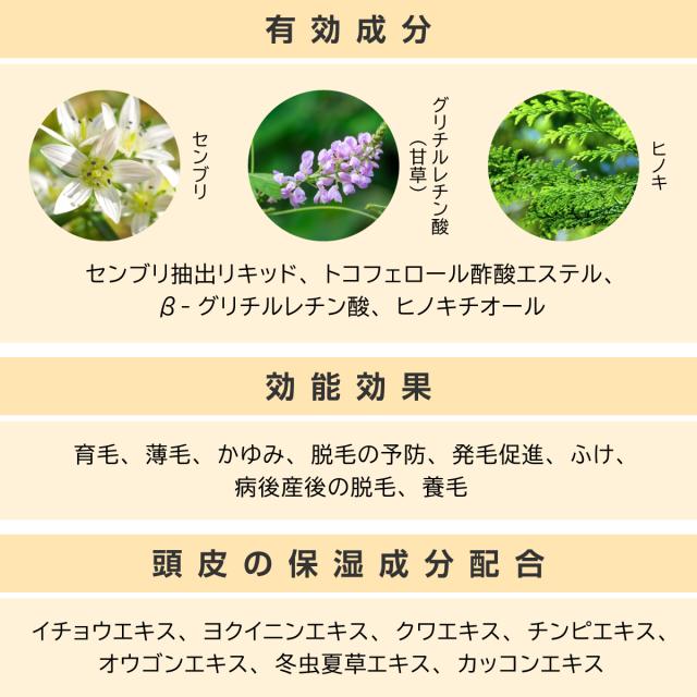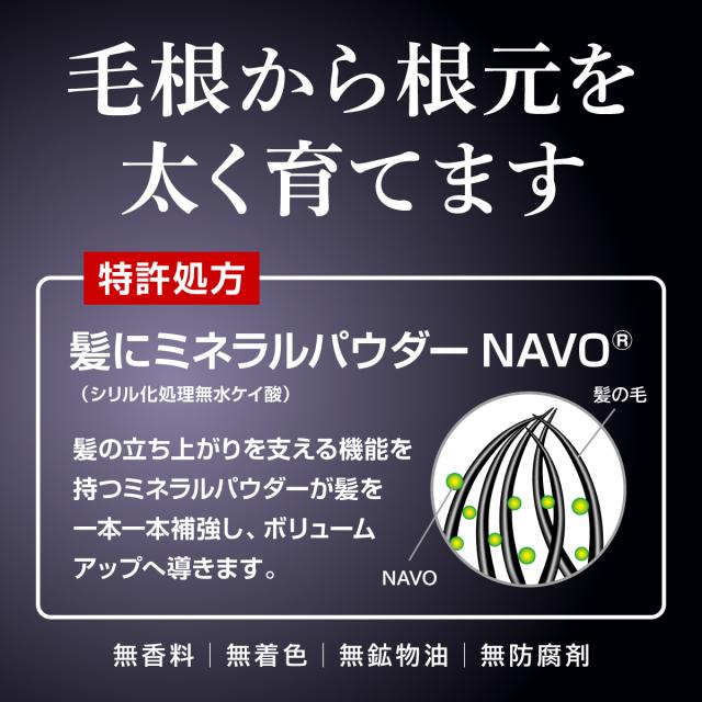 | ○無香料・無着色・無鉱物油・無防腐剤 ○毛根から根本を太く育てます 髪にミネラルパウダーNAVO(シリル化処理無水ケイ酸) 髪の立ち上がりを支える機能を持つミネラルパウダーが髪を一本一本補強し、ボリュームアップへ導きます。 ○有効成分:センブリ抽出リキッド、トコフェロール酢酸エステル、β-グリチルレチン酸、ヒノキチオール ○効能効果:育毛、薄毛、かゆみ、脱毛の予防、発毛促進、ふけ、病後産後の脱毛、養毛 ○頭皮の保湿成分配合:イチョウエキス、ヨクイニンエキス、クワエキス、チンピエキス、オウゴンエキス、冬虫夏草エキス、カッコンエキス |