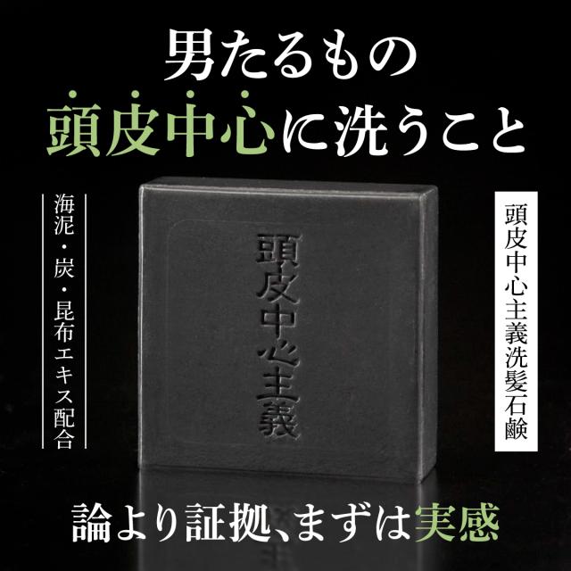 | 頭皮中心主義が真っ黒なのは、炭や海泥が入っているからです。 男性の頭皮のアブラはとても頑固。 その頑固な頭皮のアブラを、ミクロン単位の泥と炭でしっかり吸着させ、石鹸成分で落とします。 頭皮中心主義は髪にツヤやサラサラ感を与えるコンディショニング成分は一切入っておりません。 男たるもの頭皮中心に洗うこと。 ○海泥・炭・昆布エキス配合 ○無着色・シリコンフリー ○4.5×4.5×1.5cm 約1ヶ月分 |