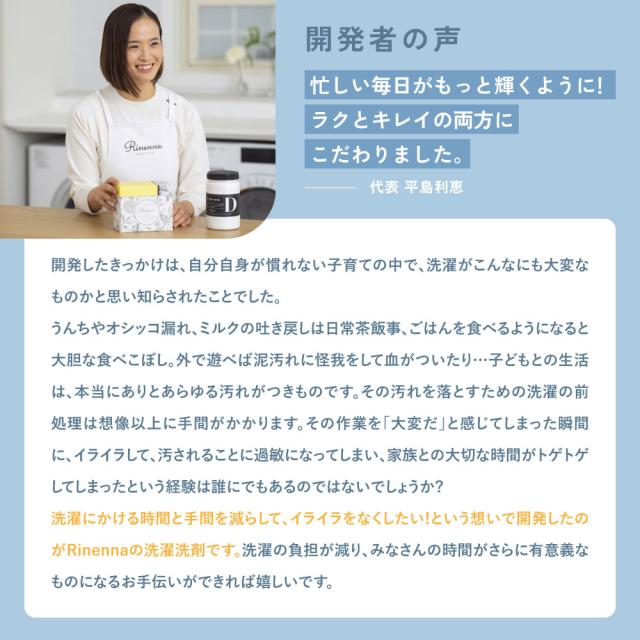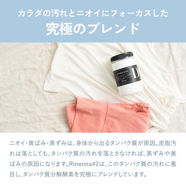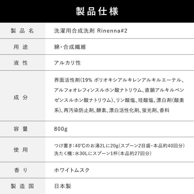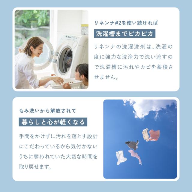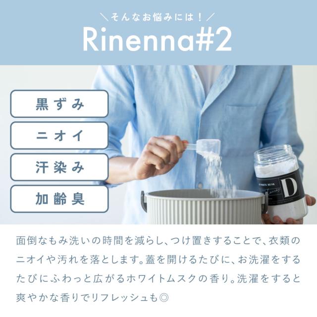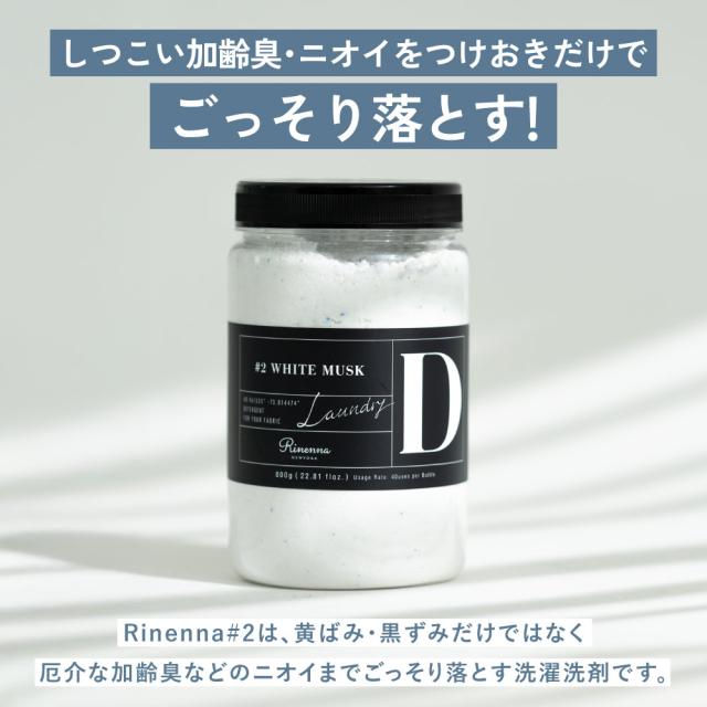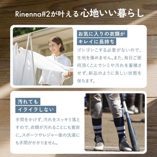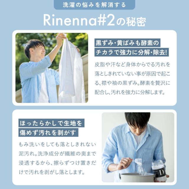 Rinenna#2は、黄ばみ・黒ずみだけではなく厄介な加齢臭などのニオイまでごっそり落とす洗濯洗剤です。