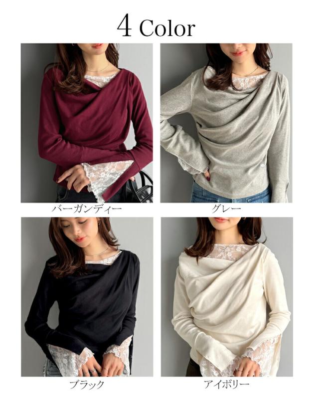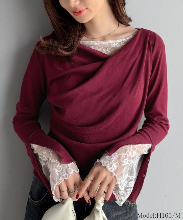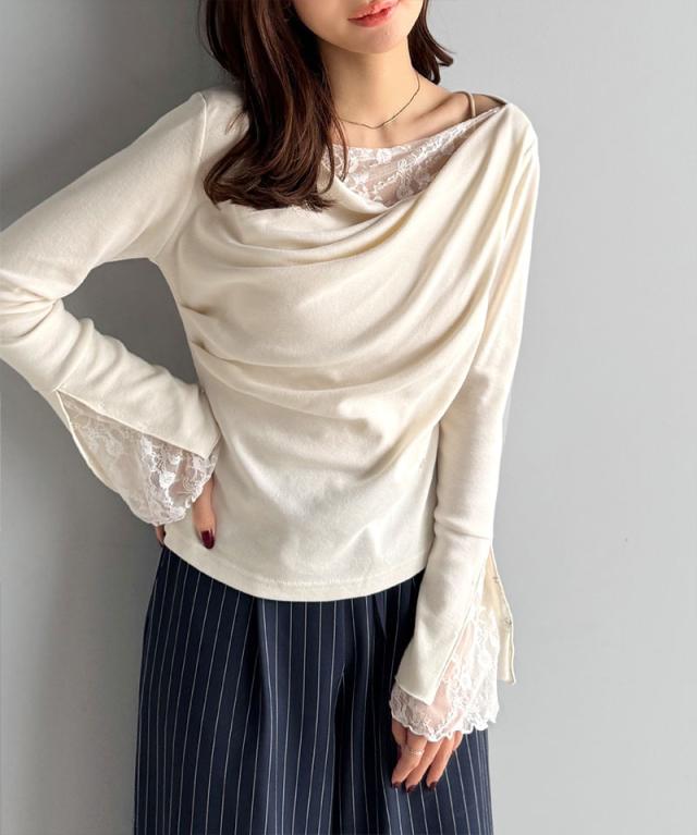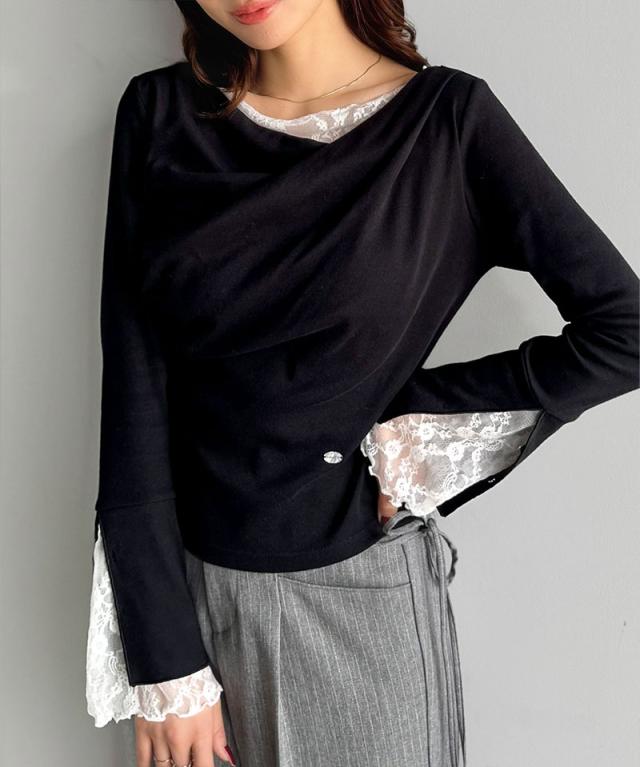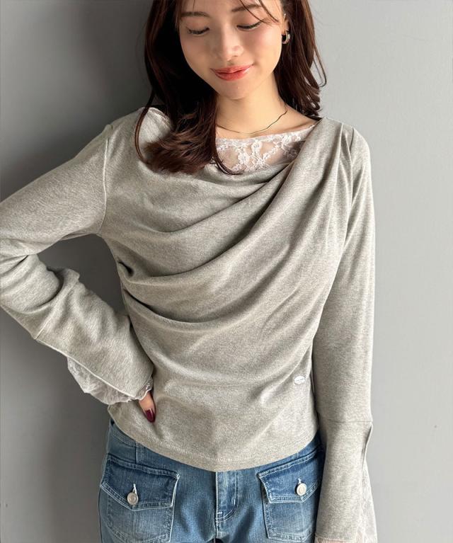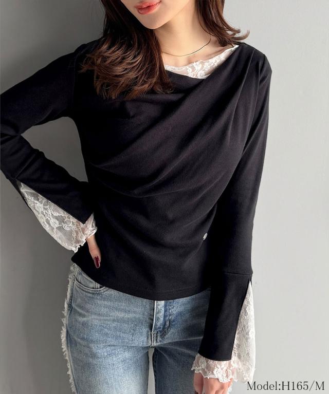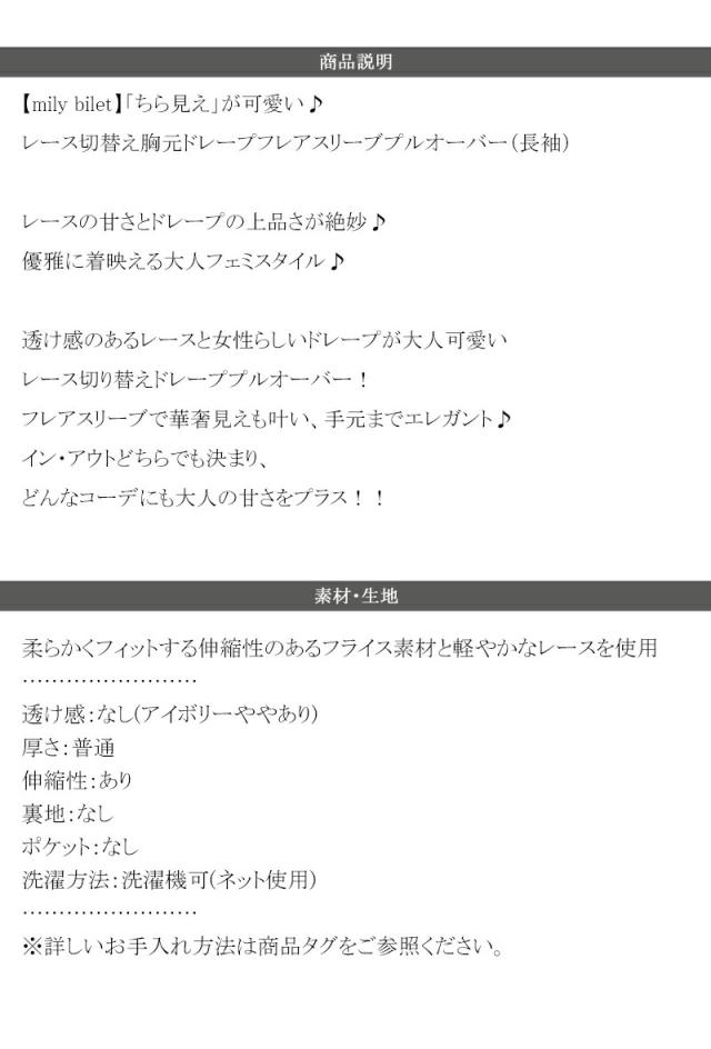 クラシカルエルフ秋新作 mily biletトップス Tシャツ レディース レース 切替え 胸元 ドレープ フレア スリーブ プルオーバー 長袖 大きいサイズ 2025aw mi1359019
