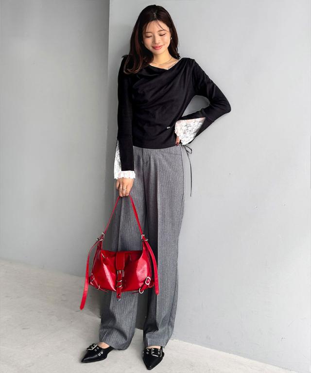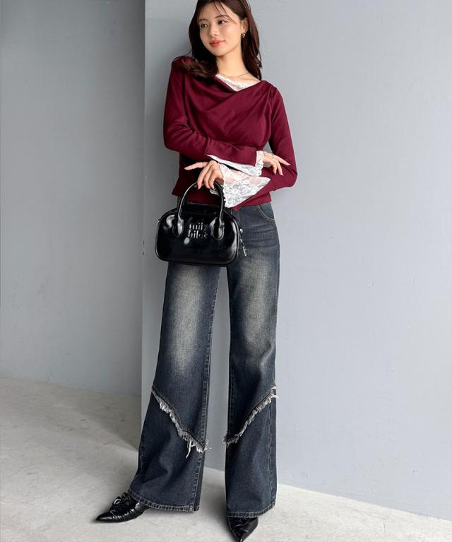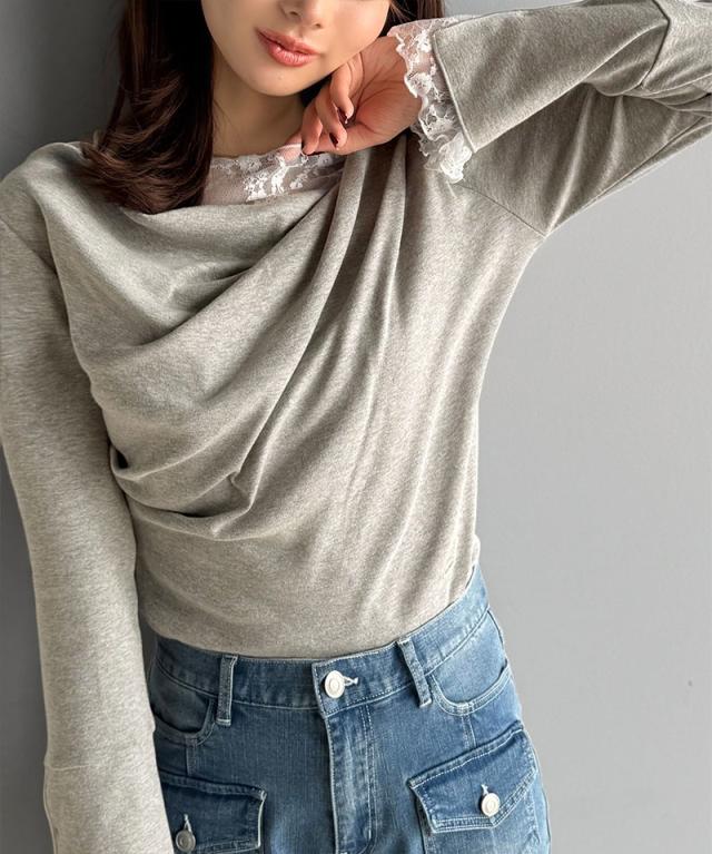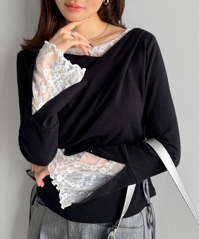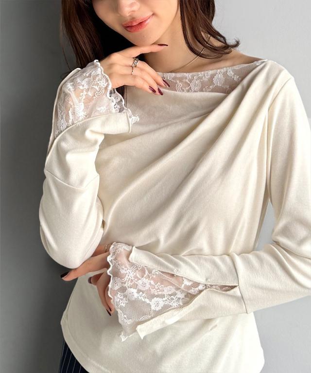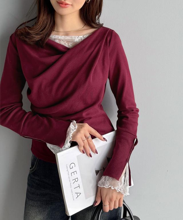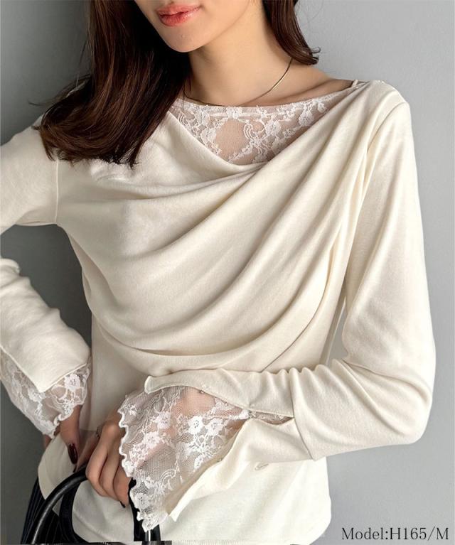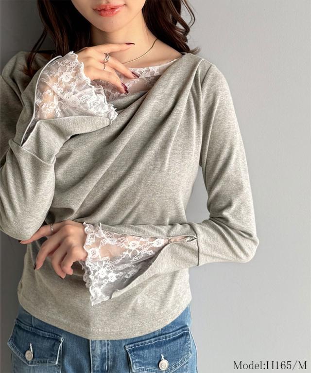 クラシカルエルフ秋新作 mily biletトップス Tシャツ レディース レース 切替え 胸元 ドレープ フレア スリーブ プルオーバー 長袖 大きいサイズ 2025aw mi1359019