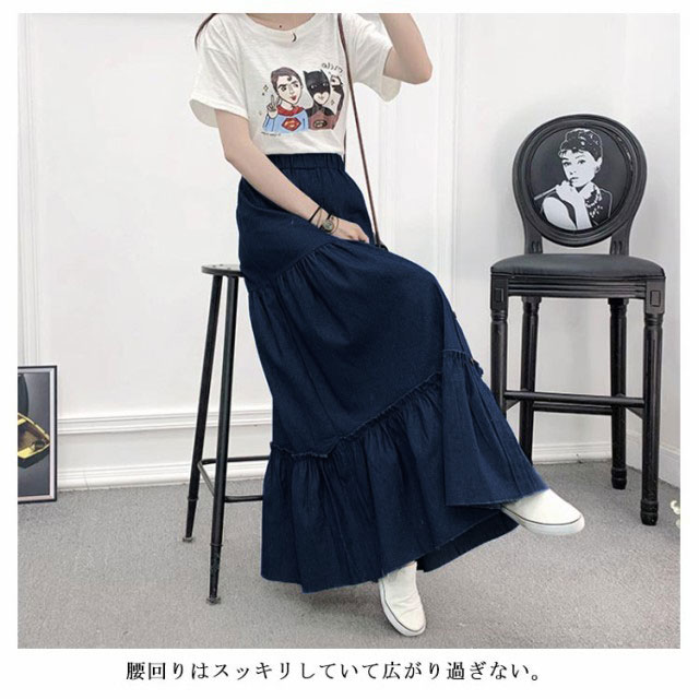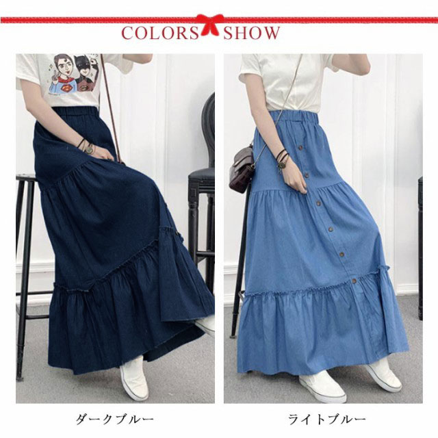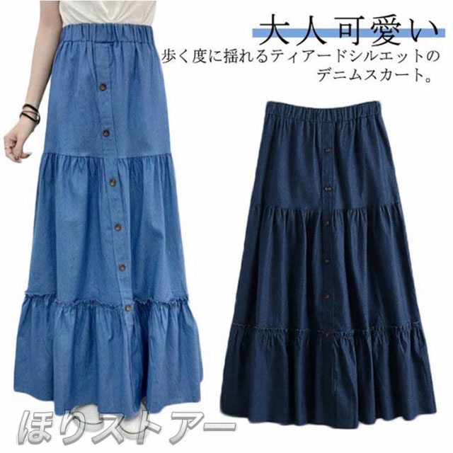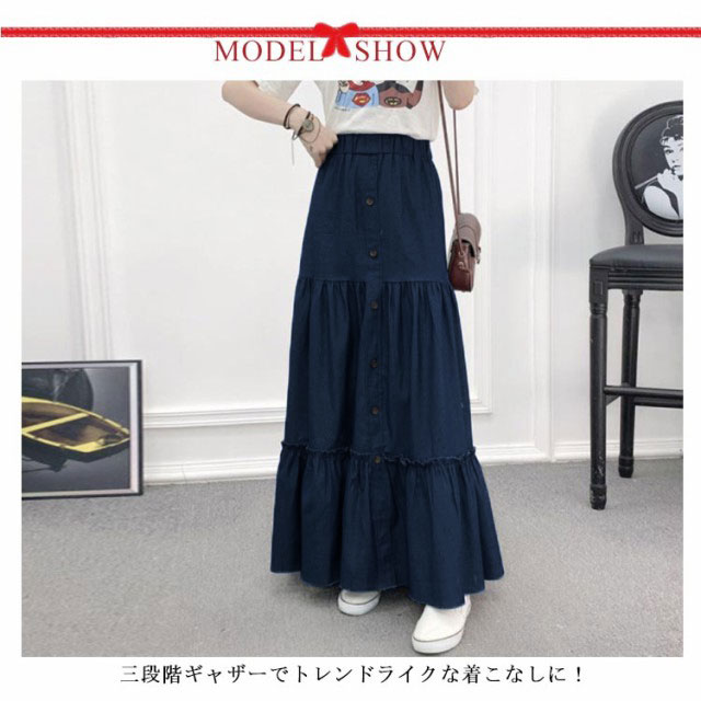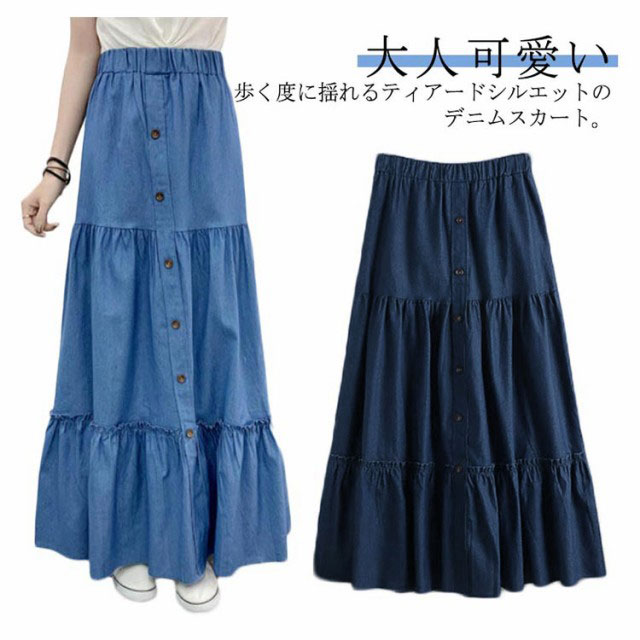 デニム ティアードスカート レディース デニムスカート 切り替え ギャザースカート ロングスカート マキシ丈 マキシスカート フレアスカート デニム ウエストゴム 大きいサイズ カジュアル きれいめ 無地 大人可愛い 春 夏 夏服