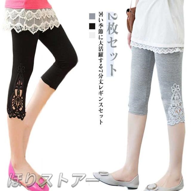 7分丈パンツ レギンス レディース 夏 夏用 薄手 涼しい 2枚セット レース 裾レース レギンスパンツ レギパン 可愛い ストレッチ UVカット 無地 シンプル 大きいサイズ ボトムス 9分丈 インナー 肌着 部屋着 ルームウェア 春 夏 大人 女性 送料無料