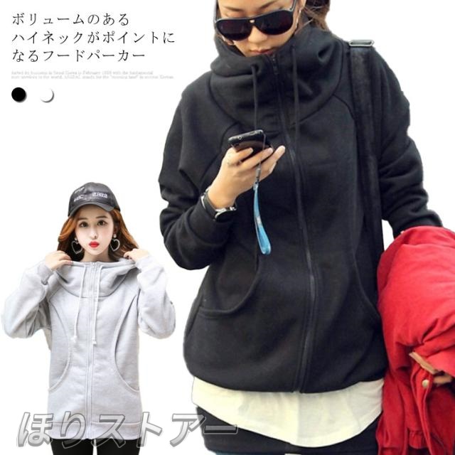 パーカー 裏起毛 レディース ハイネックパーカー スウェット ロング丈 パーカ ボリュームネック ハイネック フード付き 小顔効果 ジップアップ 無地 裏起毛 スエット スタンドネック ロングパーカー トップス 体型カバー 着痩せ 防寒 秋冬