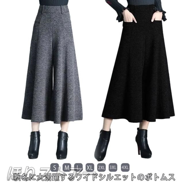 広がったスカート風!ガウチョパンツ フレアパンツ 秋冬 ワイドパンツ スカーチョ キュロットパンツ ガウチョ ズボン ポケット付き ウールタッチ 通勤 9分丈 ハイウエスト 体型カバー おしゃれ 可愛い ブラック グレー送料無料