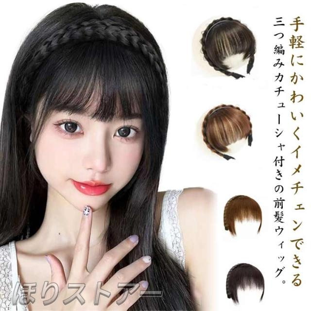 カチューシャ付き 前髪ウィッグ 三つ編みカチューシャ 3つ編み ふんわり 付け毛 部分ウィッグ ヘアアクセサリー 髪留め 白髪隠し レディース ヘアアレンジ ヘアバンド エクステ かわいい ナチュラル 自然 結婚式 黒髪 茶髪 送料無料