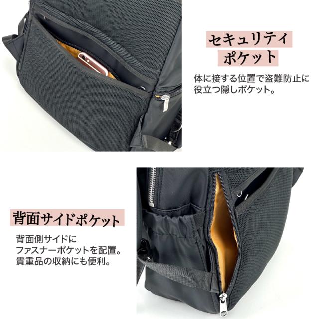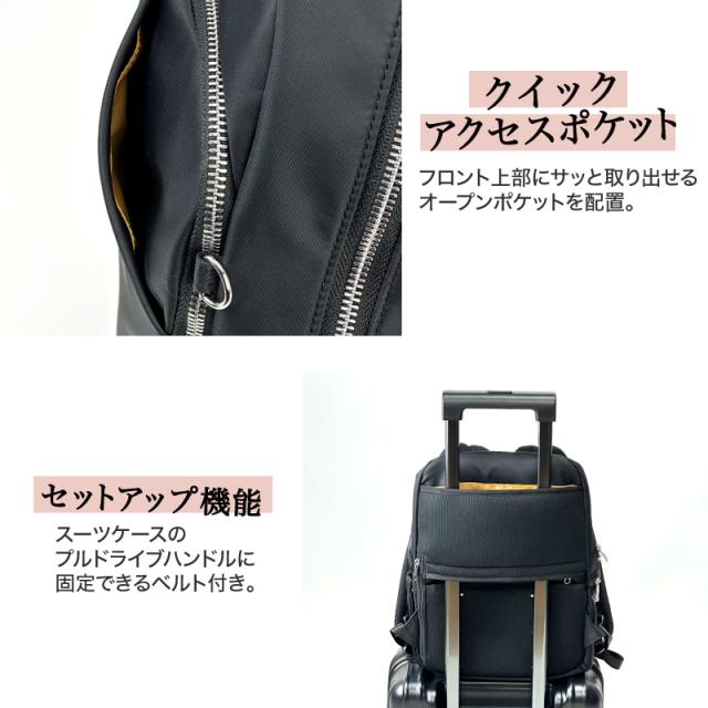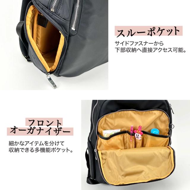 | ポケット | [外側]ファスナーポケット×3(内1つ:オープンポケット×2、ペン差し×2)、オープンポケット×1、サイドポケット×1、スルーポケット×1、Dカン×1 [内側]PCポケット×1、ファスナーポケット×1 |
