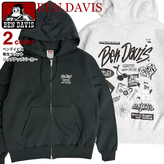 BEN DAVIS パーカー ベンデイビス イラスト 発泡 バックプリント ジップパーカー メンズ 裏起毛 スエット ユニセックス BEN-2235