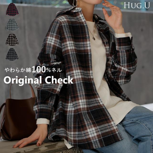 2025AW新作 シャツ 綿100% ネルシャツ チェック レディース ブラウス トップス ロング ロングシャツ チュニック 長袖 総柄 羽織 ライトアウター レイヤード きれいめ ゆったり 大きいサイズ 体型カバー お尻が隠れる コットン カジュアル 秋 冬 HUG.U