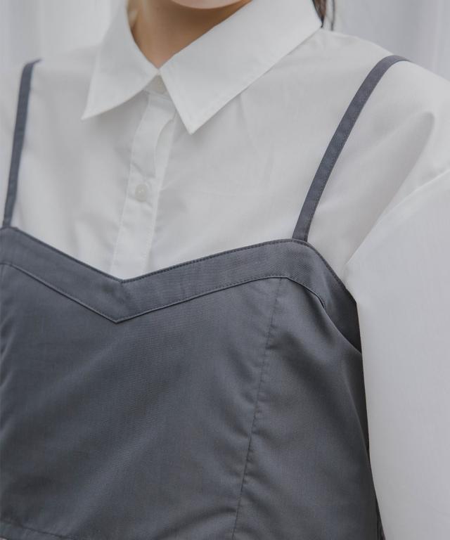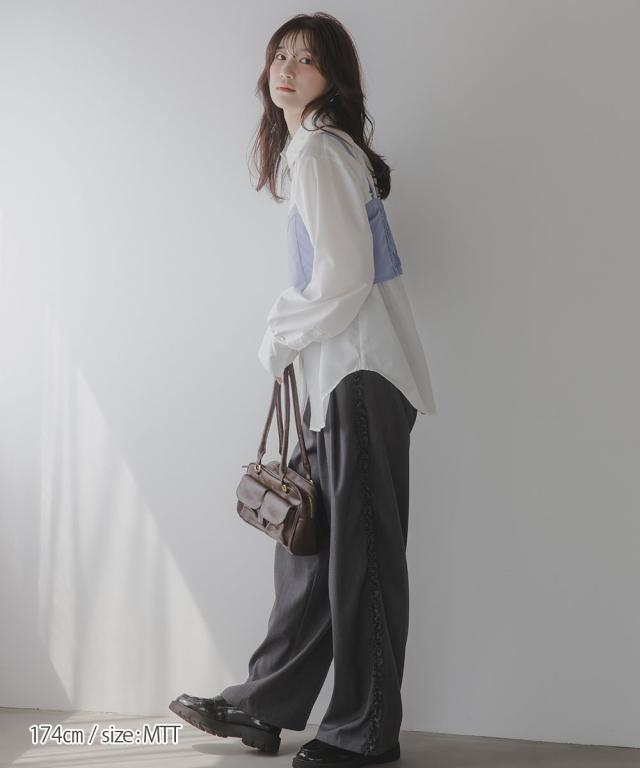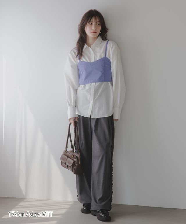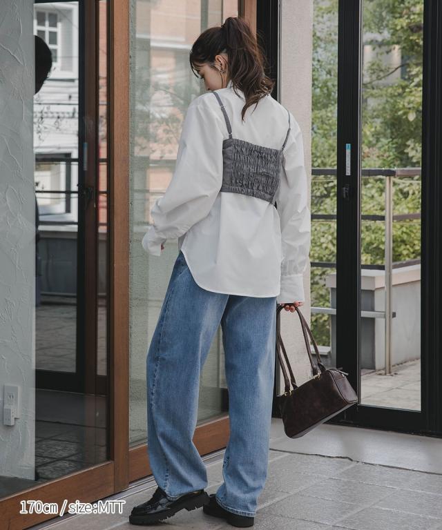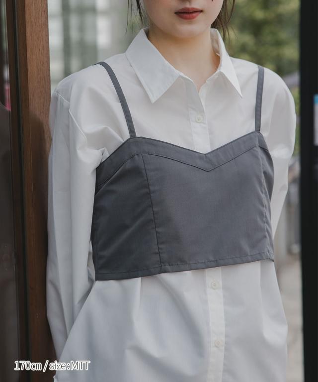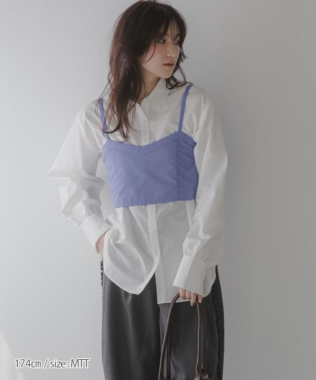 【高身長な方向け】トレンドのビスチェが付いたこなれシャツセット■デザイン・シャツはややゆったりとしたラフに着れるシルエット。・ビスチェは後ろ部分にゴムを入れているので着脱がラクチンです。 また肩ひもはお好みの位置に調節可能です。■素材・風合いのよいブロードシャツ素材。 シワにあまりなりにくく程よくハリがあります。■おすすめのスタイリング着るだけでトレンド感あるスタイリングに仕上がります。デニムやスラックス系のパンツと相性ばっちりです。それぞれ単体で使えるのも嬉しいポイント。ビスチェはジャストサイズのコンパクトTシャツとのレイヤードがおすすめです