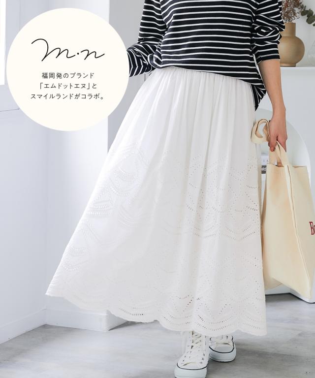 「m.n(エムドットエヌ)」とスマイルランドがコラボ!福岡発のブランドが贈る、毎日をちょっと幸せにする大人のためのデイリーウェア。着るだけで気分が上がる、綿100%のパネルスカラ刺繍スカートで、いつものお出かけをもっと特別に。動きやすさ、着回しやすさ、そしてお手入れのしやすさまで、忙しいあなたの「楽ちん」をトコトン追求しました。■デザイン裾にあしらわれた繊細なパネルスカラ刺繍が、大人の女性にふさわしい上品さと華やかさを演出するロングスカート。総丈が長めなので、気になる下半身のラインを自然にカバーし、すらりとした印象を与えます。ウエストは総ゴム仕様で、締め付け感がなく、一日中快適な着心地。両脇には便利なポケットが付いているので、ちょっとした小物を収納するのにも困りません。シンプルなトップスと合わせるだけで、洗練された大人のカジュアルスタイルが完成します。普段使いはもちろん、ちょっとしたお出かけにも活躍する、着回し力抜群の一枚です。■素材肌触りの良い綿100%素材を使用しているため、吸湿性に優れ、これからの季節にぴったりの清涼感あふれる着心地です。裏地付きなので、透け感を気にせず安心して着用いただけますが、淡色はインナー