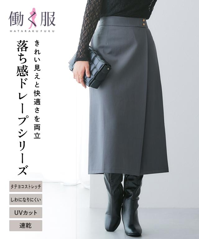ロングスカート レディース 落ち感ドレープ素材 ウエスト 金ボタンラップ風タイト スカート タテヨコ ストレッチ しわになりにくい 速乾 UVカット ニッセン