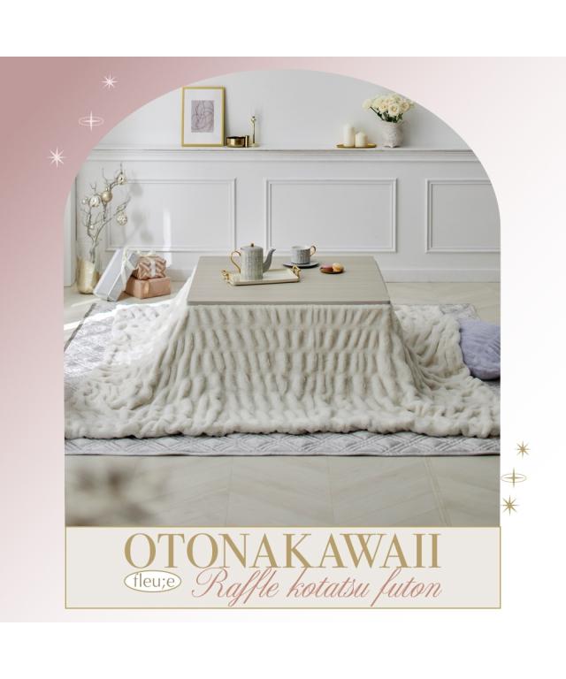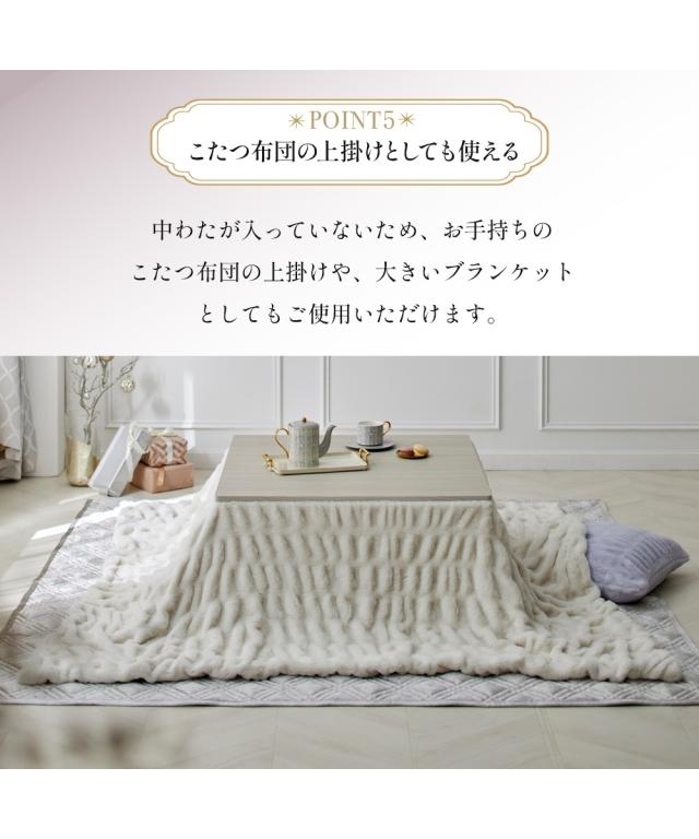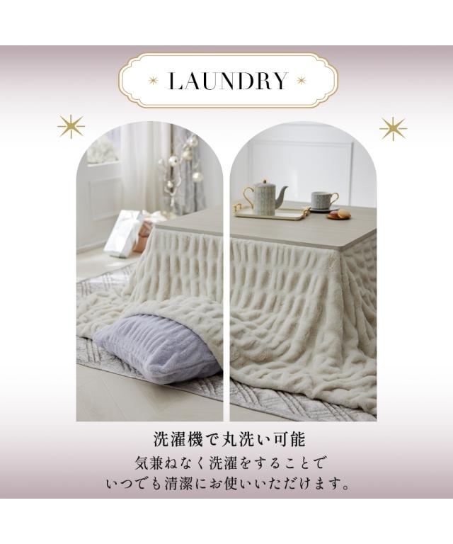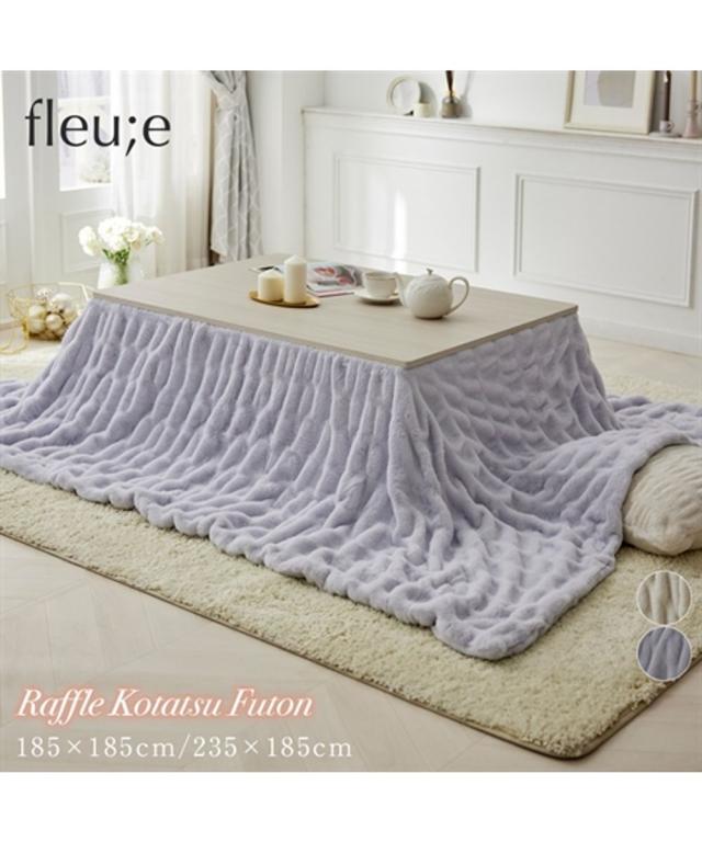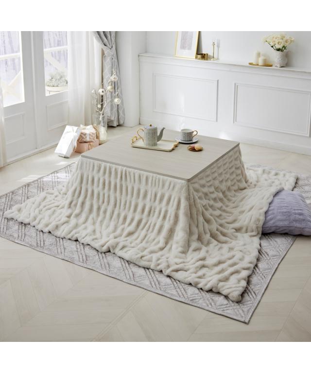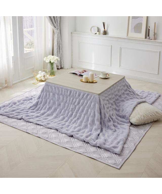 "カバーとしても使える、とろける大人可愛いくしゅくしゅこたつが登場!トレンドのラビットファーにくしゅくしゅとした立体的なデザインが、他にはない洗練された印象に。お部屋のインテリアにさりげないアクセントとなり、fleu;eらしい上質な空間を演出します。<おすすめ>●くしゅくしゅデザインくしゅっとしたデザインが特徴のくしゅくしゅ毛布。伸縮性がある糸を織り込むことで、より立体感のある大人可愛いブランケットに仕上げました。●とろける肌触り高密度のラビットファー調素材を使用。とろけるようななめらかな肌触りに仕上げた贅沢な一枚です。裏面はフランネル素材で、ふわふわとした肌触りが虜に。●ニュアンスカラースモーキーなくすみカラーでインテリアに馴染みやすくなっております。●二枚合わせでしっかりあたたかい2枚の生地を重ねることで、生地と生地の間に空気の層が生まれます。空気の層を閉じ込めることで暖かい空気を逃がさず、あったか。●こたつ布団カバーとしても使える中わたが入っていないため、お手持ちのこたつ布団の上掛けや大きいブランケットとしてもご使用いただけます。●洗濯機で洗えるいつも清潔・快適に保てます。<説明>fleu;e(フルーエ)【BRAND CONCEPT