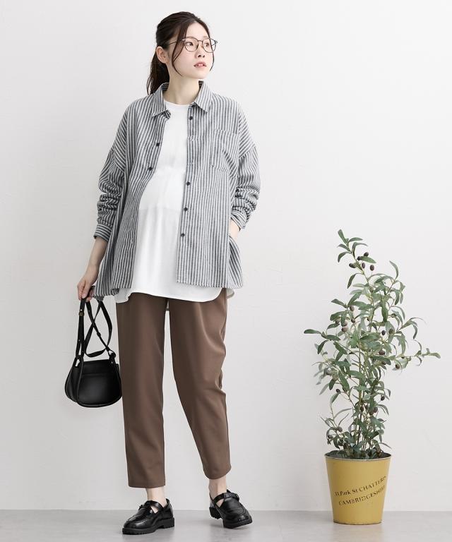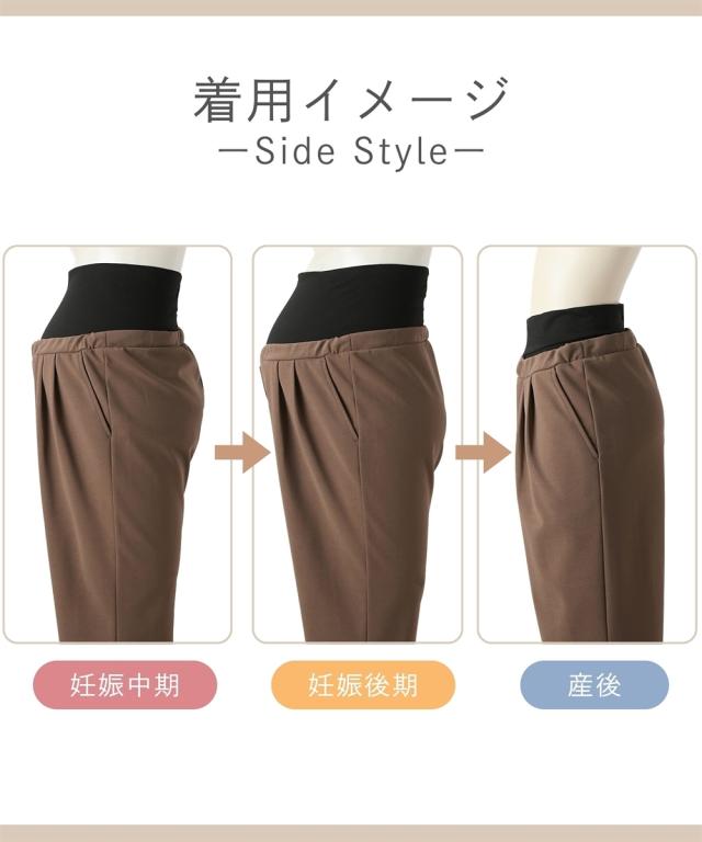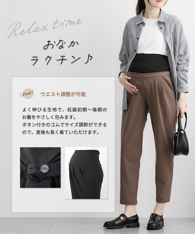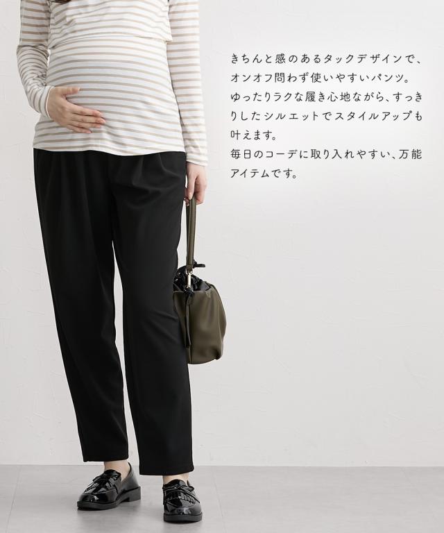 オフィスやお出かけにおすすめ!きれい見えするマタニティタックパンツです。■design・ゆったりとしたテーパードシルエットで、きちんと感のあるキレイめデザイン。 足首はすっきり見せつつ、お尻や太ももはややゆとりを持たせて、下半身を自然にカバーします。・通勤はもちろん、ちょっとしたお出かけや普段使いにもぴったりな万能パンツです。■point・ウエスト部分には伸びの良い柔らかな生地を使用し、お腹を締め付けにくく快適な履き心地。・ウエストの切り替え部分はボタン付きゴム仕様でサイズ調節が簡単。産後も長く着用できます。・両脇にはポケット付きで、スマホやハンカチなどの小物収納にも便利です。■fabric・ドレープ性のある梨地素材を使用し、さらっとした肌ざわりが魅力です。