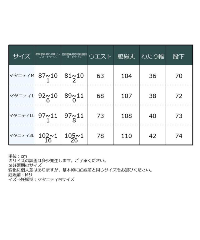 品質:[本体]【ブラック】ポリエステル95%・ポリウレタン5%【モカ】ポリエステル100% [おなか部分]【共通】ポリエステル90%・ポリウレタン10% 透け感:透けない 伸縮性:【ブラック】あり【モカ】ややあり 生地の厚み:普通 開き:なし 裏地:なし ポケット:両脇 ウエスト:ボタン付き総ゴム仕様・別布切り替え 季節:秋・春向き シルエット:ゆったり 原産国:中国製 備考:洗濯機OK(ネット使用) 単位:cm ※サイズの誤差は多少発生します。ご了承ください。 ※妊娠期のサイズ変化に個人差はありますが、基本的に妊娠前と同じサイズをお選びください。 妊娠前:Mサイズ⇒妊娠期:マタニティMサイズ