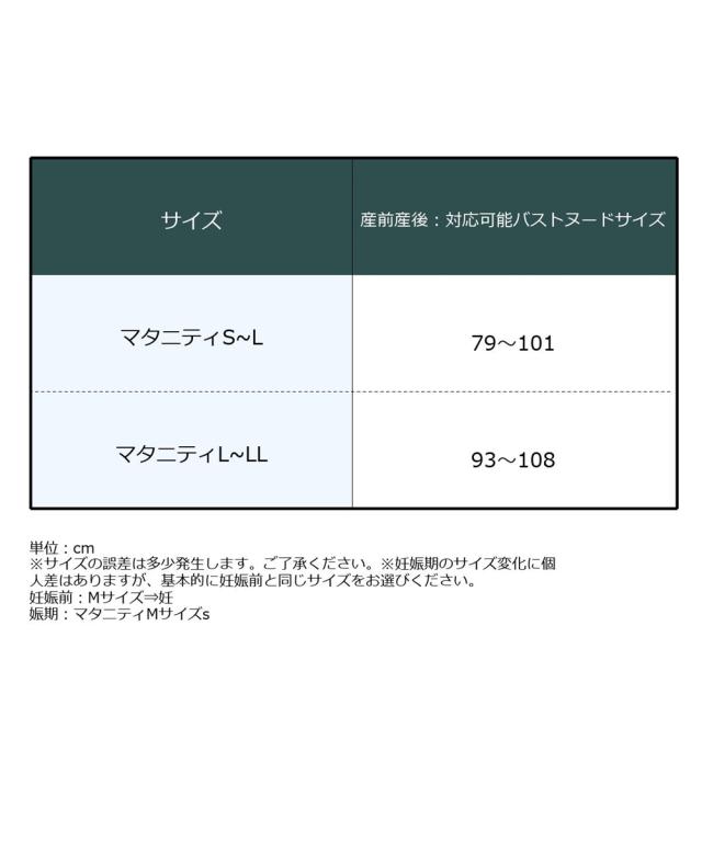 品質:ナイロン64%・ポリウレタン36% 伸縮性:あり 開き:なし カップ:あり(取り外し可能) 季節:通年 原産国:中国製 備考:洗濯機OK(ネット使用) 単位:cm ※サイズの誤差は多少発生します。ご了承ください。※妊娠期のサイズ変化に個人差はありますが、基本的に妊娠前と同じサイズをお選びください。 妊娠前:Mサイズ⇒妊娠期:マタニティMサイズs
