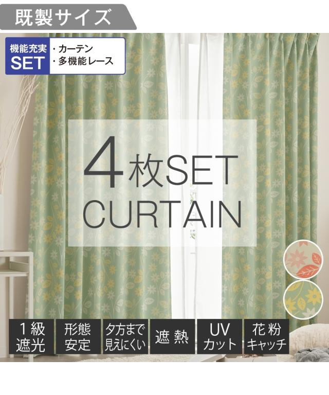 【カーテンセット】1級遮光カーテン(形態安定)&遮像・遮熱・UVカット・花粉キャッチ・ミラーレース4枚セットカジュアルフラワー