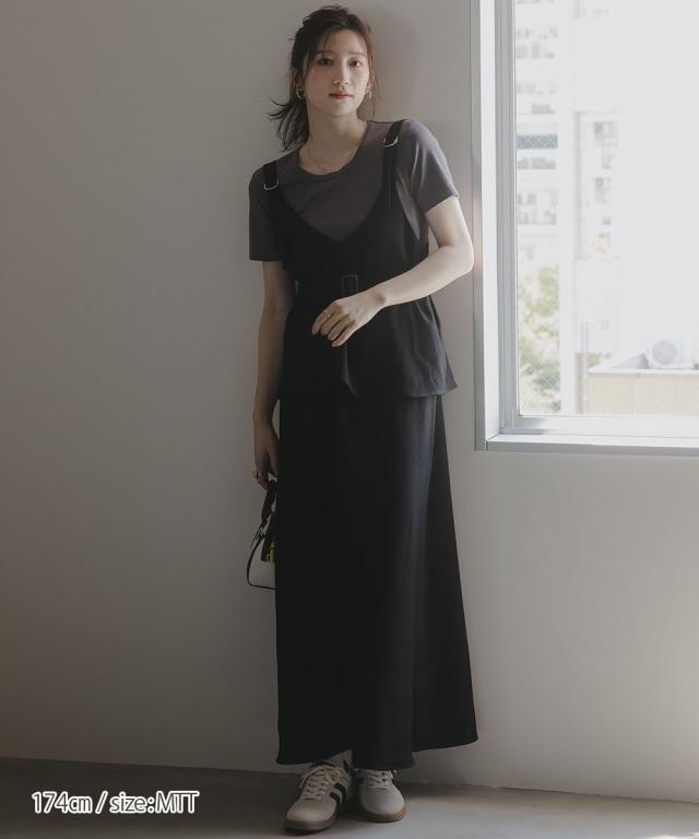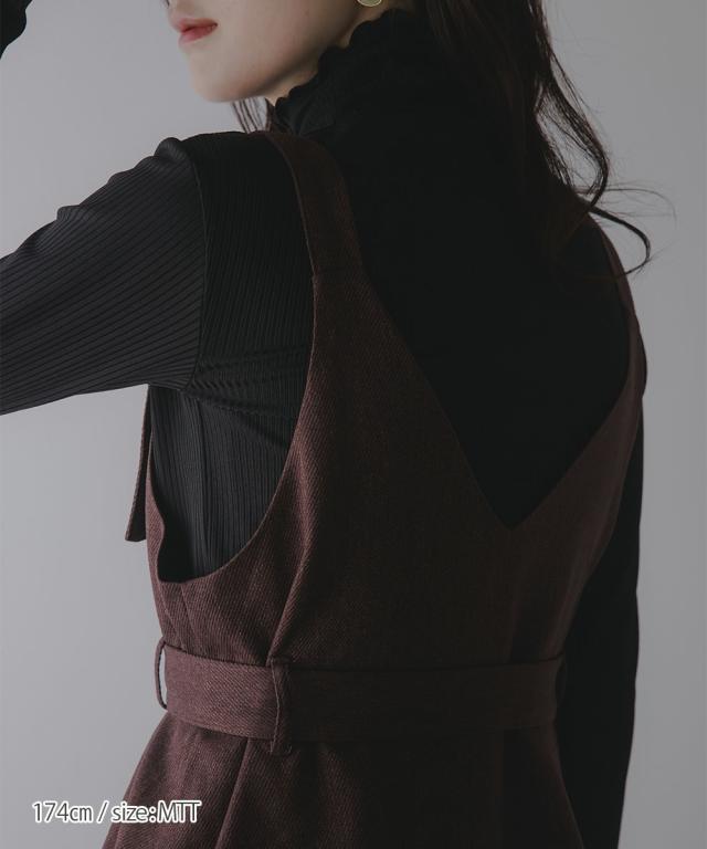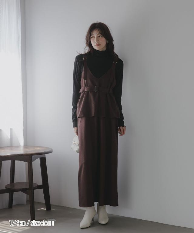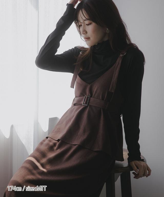 【高身長な方向け】ペプラムデザインが上品で可愛いジャンパースカート■デザイン・すっきり見えするVネックデザイン。肩ベルトは調節が可能です。・ウエストベルト付きでメリハリあるシルエットに。・ペプラムデザインで腰回りをさりげなくカバー ■素材・秋冬にぴったりな起毛ツイル素材。 あたたかみのある雰囲気です。■おすすめのスタイリング長いシーズン着れるジャンパースカート。気温に合わせてインナーを変えてお楽しみください!半袖、長袖問わず相性ばっちりです