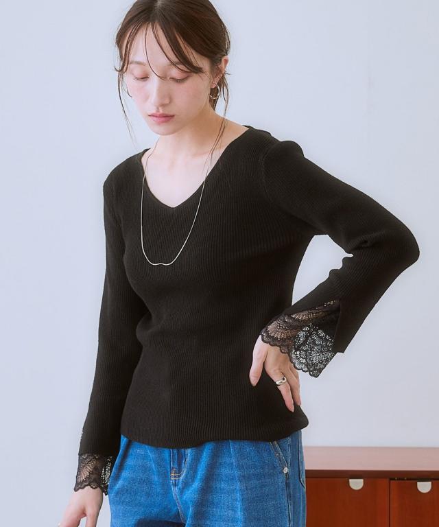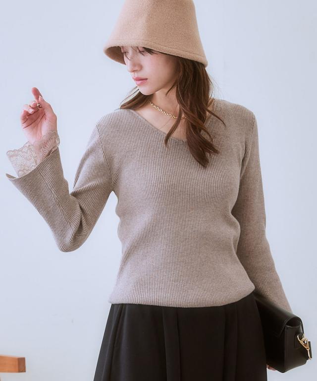 【ふんわりモチモチ素材】袖口レースVネックリブニットニッセン nissen
