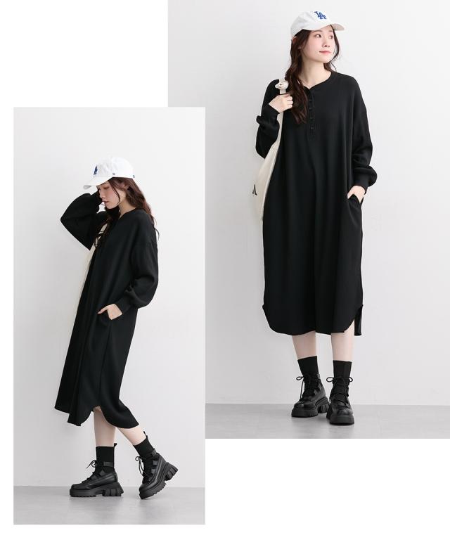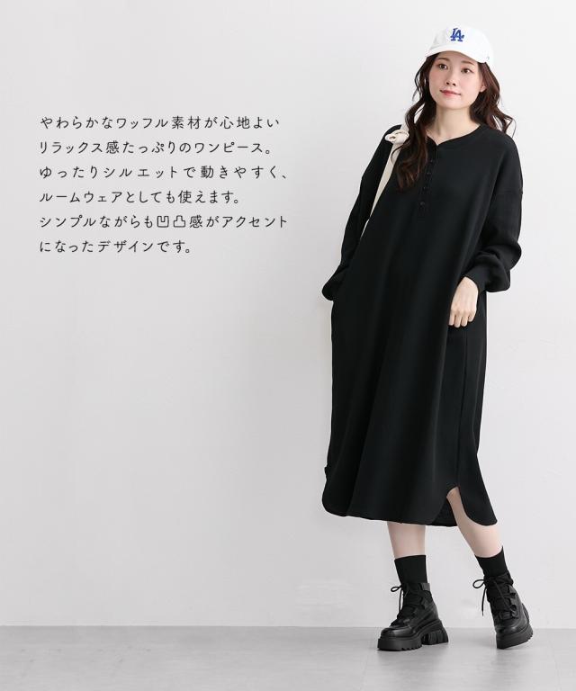 やわらかなワッフル素材の長袖ワンピースです。■design・体型をカバーするゆったりしたシルエットで、リラックス感たっぷりのワンピース・お出かけはもちろん、ルームウェアとしても使えます。・シンプルな無地ながら、ワッフル素材の凹凸感がアクセント・裾にはカーブスリット入りでこなれ感を演出します。■point・胸下付近までボタンがあるので、ボタンを開けてスムーズに授乳ができます。・袖口がリブになっているので腕をまくりやすく、家事や育児の際に便利です。・両脇にポケットがあり、スマホやハンカチなどを入れられます。■fabric・凹凸があり、さらっと気持ちいいワッフル素材を使用。やわらかくてラクな着心地です。