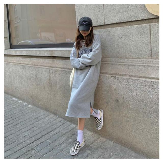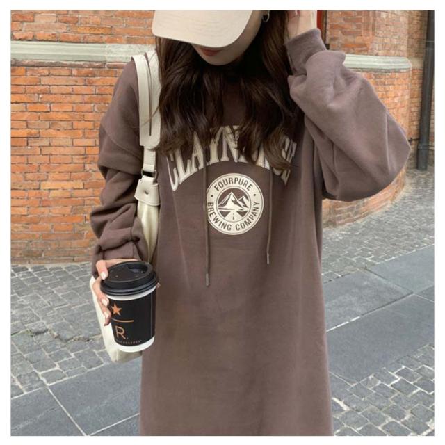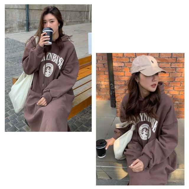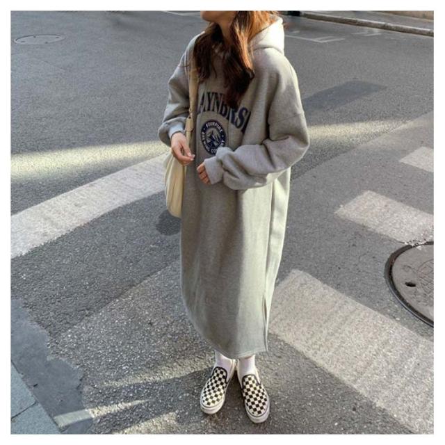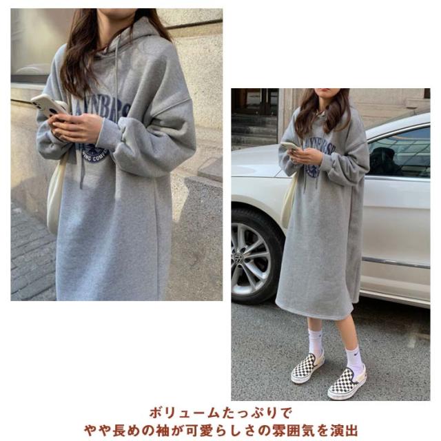 パーカーワンピース 裏起毛 パーカー ゆったり フード付き 膝下丈 ワンピース レディース ロング丈 パーカー サイドスリット スウェットワンピース プルオーバー フーディー 厚手 秋 冬 防寒 保温 暖かい オーバーサイズ 韓国ファッション 体型カバー ロゴ 部屋着