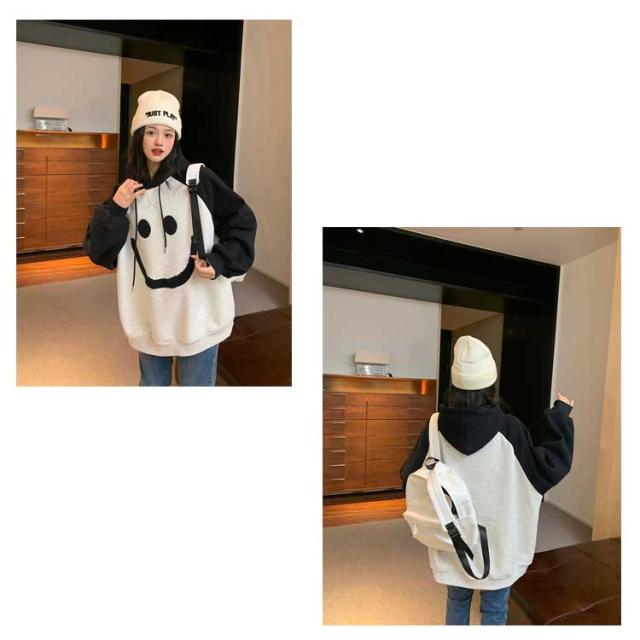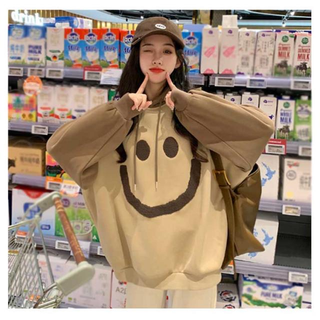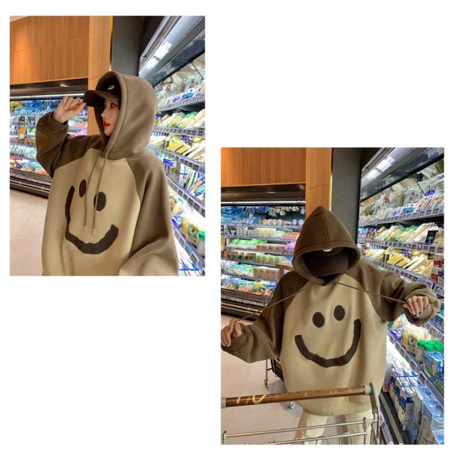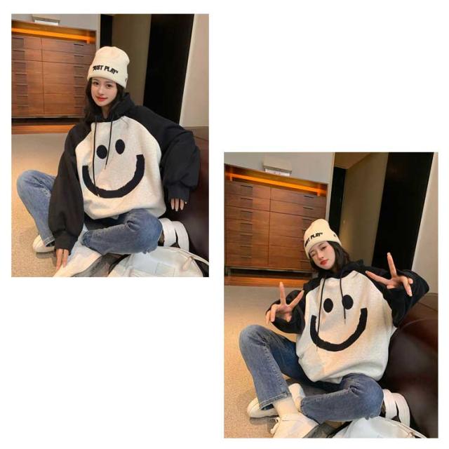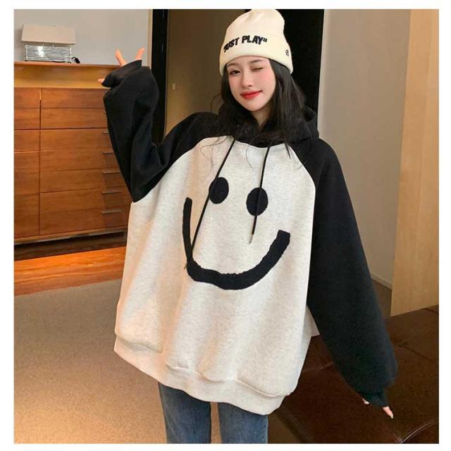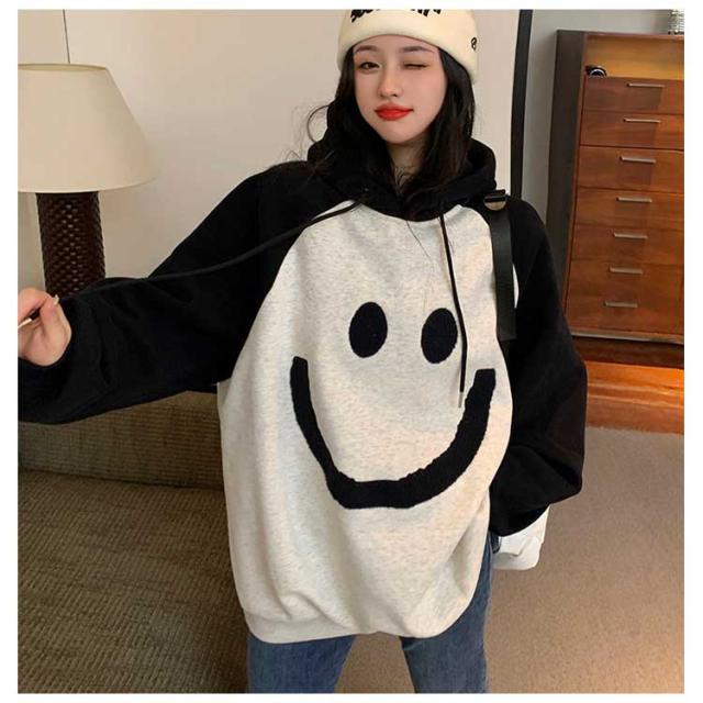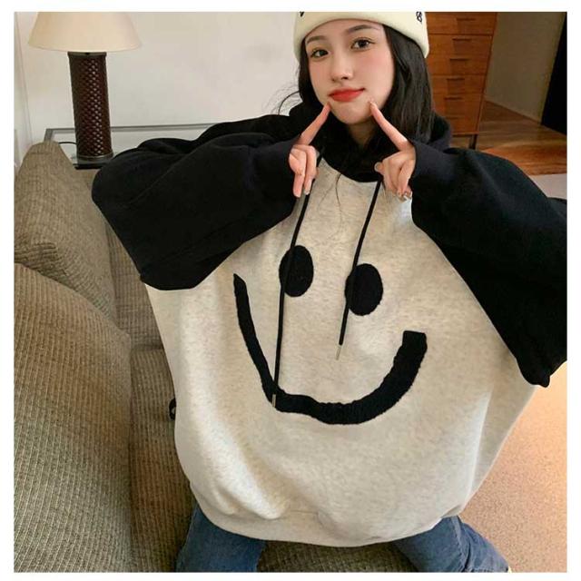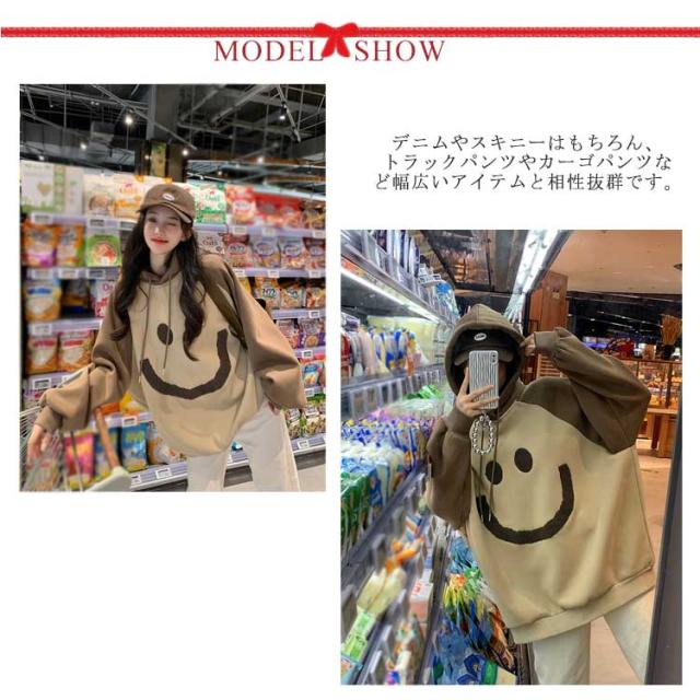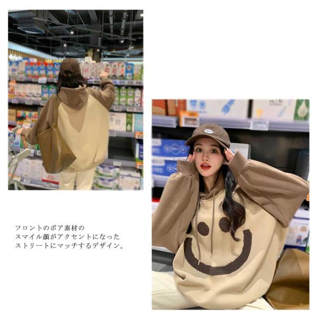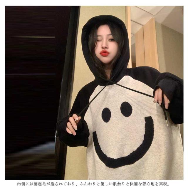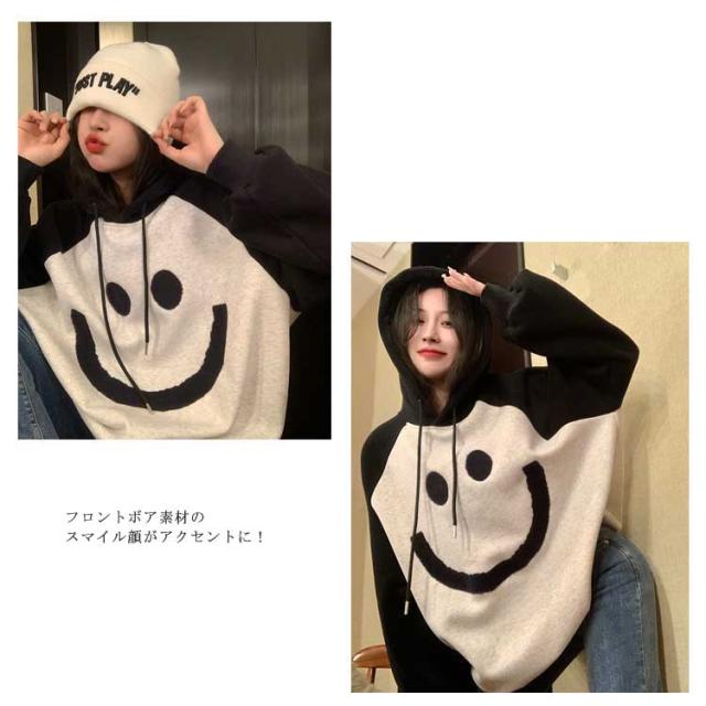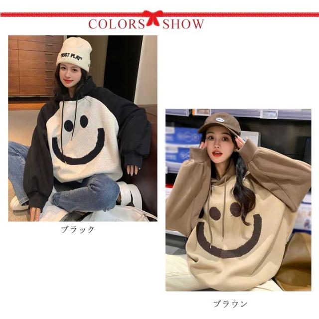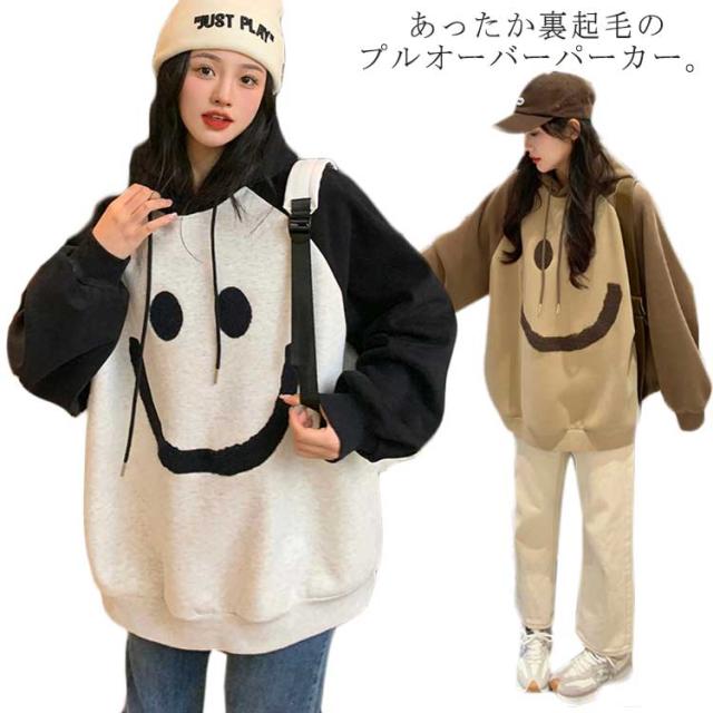 【送料無料】プルオーバー パーカー 裏起毛 配色 スマイル レディース スウェットパーカー フーディー フード付き ゆったり オーバーサイズ ボリューム袖 厚手 防寒 トップス 秋 冬 あたっか 学生 女子 可愛い ルーズ カジュアル