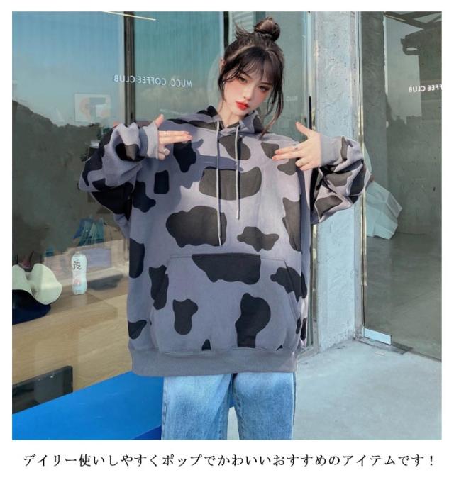 パーカー トレーナー レディース 長袖 トップス 薄手 プルオーバー フード付き フーディー 牛柄 ルーズ ゆったり 大きいサイズ 体型カバー ダンス 衣装 ヒップホップ カジュアル 韓国ファッション 大きいサイズ 個性的 原宿系 可愛い 春 秋 冬 スポーツ 通学 通勤 送料無料