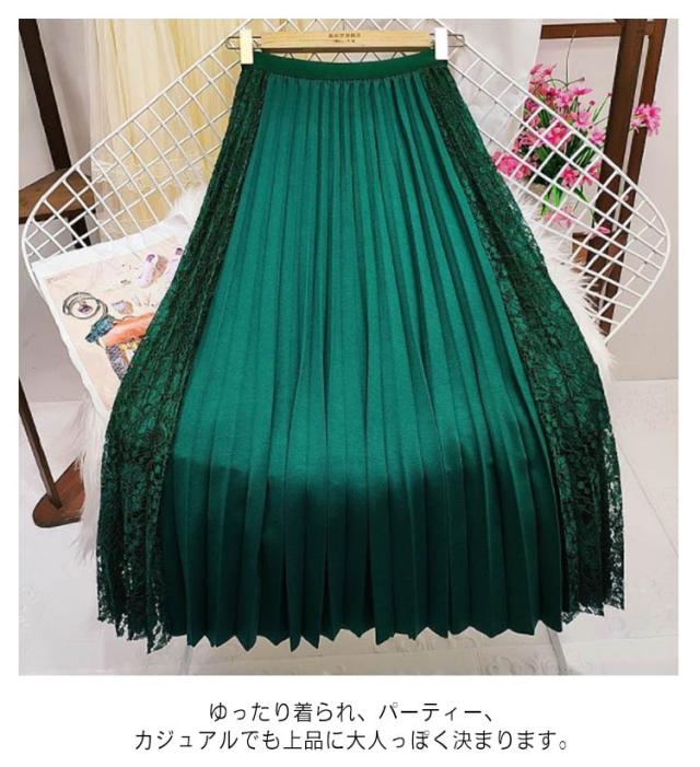 送料無料 プリーツスカート レース 切り替え 透かし編み ロングスカート スカート フレアスカート ウェストゴム おしゃれ 春 秋 冬 Aライン 通勤 シンプル エレガント ビンテージ 体型カバー