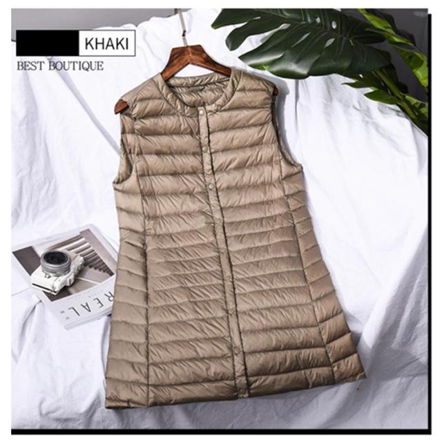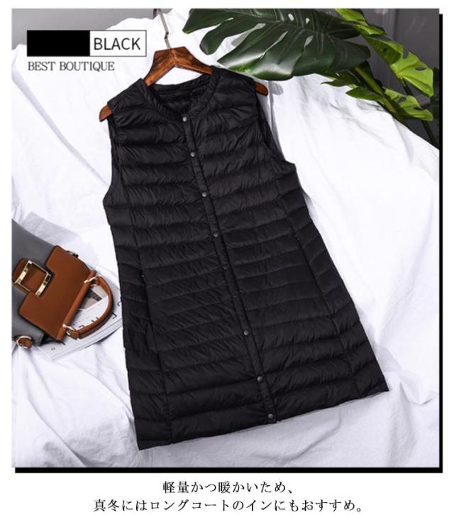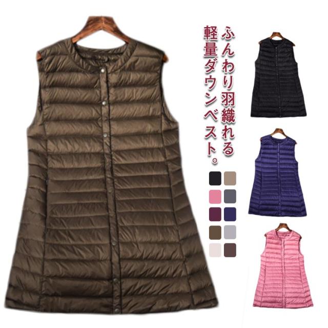 ロング ダウンベスト レディース 女性用 収納ポーチ付き 薄手 軽量 ノースリーブ 袖なし ノーカラー 秋 冬 無地 全10色