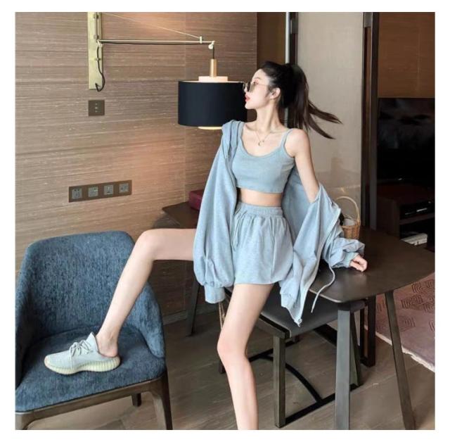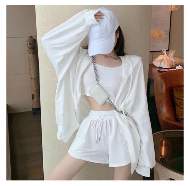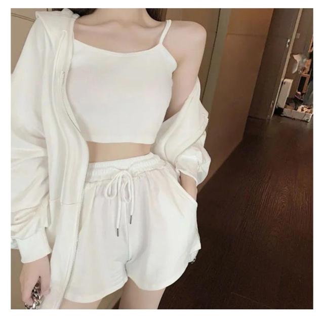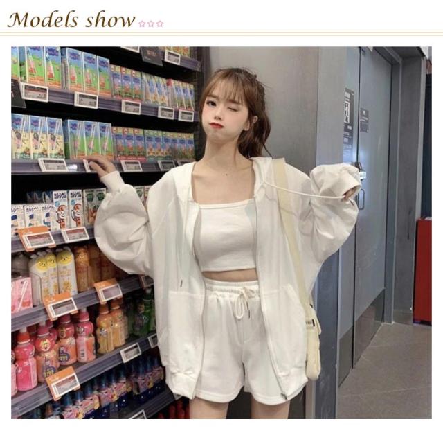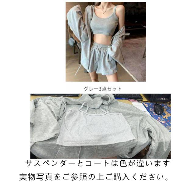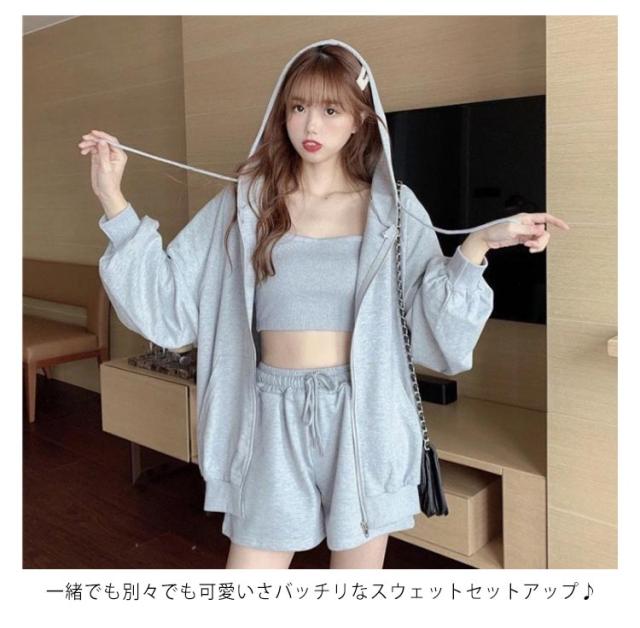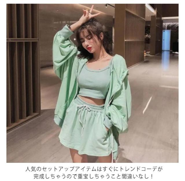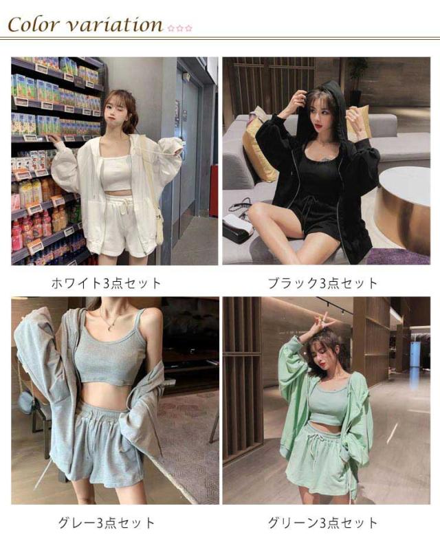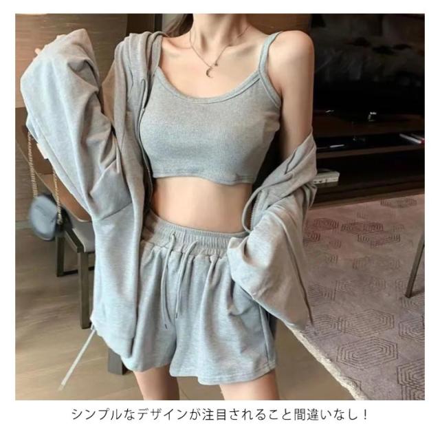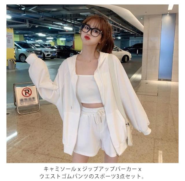 スポーツセットアップ レディース 3点セット パーカー キャミソール ショートパンツ 短パンツ UVパーカー 紫外線対策 春 夏 秋 上下セット スウェット スポーツ カジュアル ユニーク きれいめ 無地 シンプル ゆったり 体型カバー 送料無料 S M L