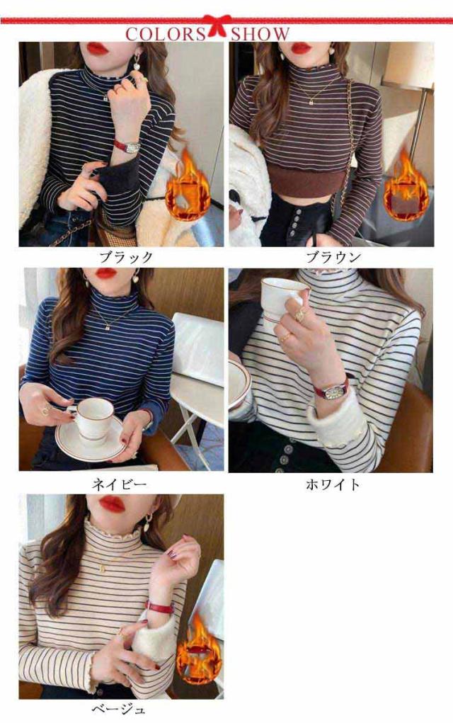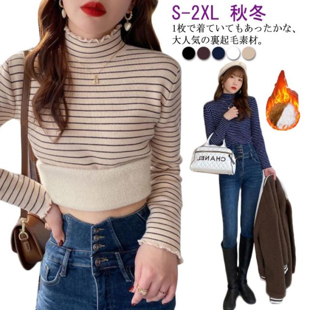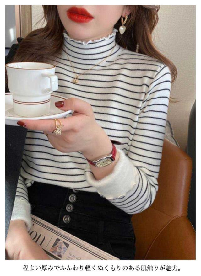 レディース 裏起毛 カットソー トップス Tシャツ ボーダー フリル ハーフタートルネック 長袖 ストレッチ 可愛い シンプル 大人可愛い 秋 冬 全5色