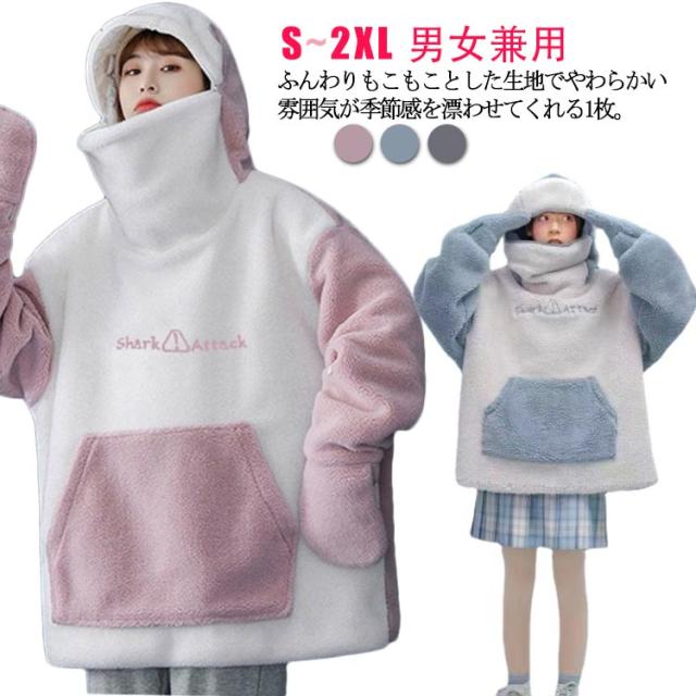 サメ ボア パーカー カップル 男女兼用 レディース メンズ フード付き サメ柄 かわいい ロング プルオーバー パジャマ スウェットパーカー 韓国風 もこもこ 裏起毛 ペアルック 部屋着 ゆったり ビッグシルエット 体型カバー 秋 冬 春 秋冬 おしゃれ 送料無料