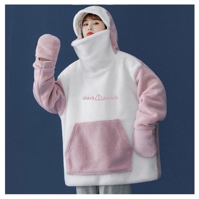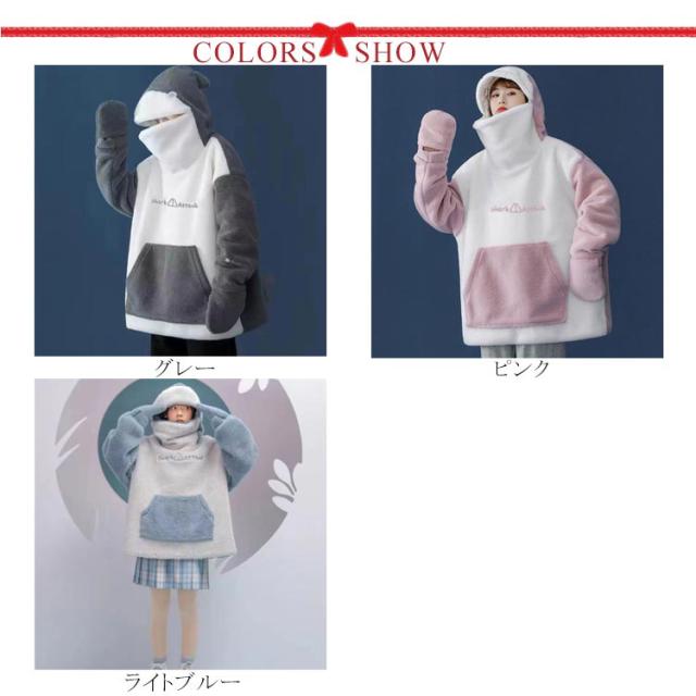 | ふんわりもこもことした生地でやわらかい雰囲気が季節感を漂わせてくれる1枚。 柔らかい着心地で肌触りがとても良くて、秋冬から春ロングシーズン使えるアイテム。 サメの口のように見えるジッパー式フードが個性溢れ、面白い。バックしっぽ付きより後ろ姿も可愛い。 もこもこ可愛く暖かいルームウェアでお家時間が楽しくなります。 ゆったりとしたシルエットと大きいフード付きなので、おしゃれなデザイン感が持ちながら、体型カバー効果も! 上品さと可愛らしさを兼ね備えたデザインで、ペアルック/カップルパーカーとしてもおすすめします。 | |