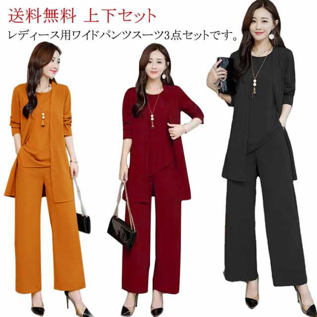 ワイドパンツスーツ レディース 3点セット セットアップ タンクトップインナー+カーディガン+ワイドパンツ 長袖 ノースリーブ オフィス 通勤 大きいサイズ 秋 無地 全3色