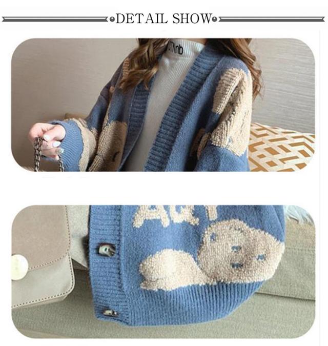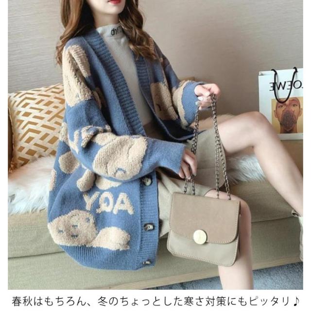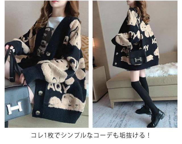 くま柄 ニット カーディガン ボア 生地 レディース 秋 冬 長袖 ニットカーディガン セーター アウター 羽織 前開き 厚手 Vネック ボタン ニットカーデ ゆったり 黒 ブラウン レッド くま 総柄 通勤 通学 防寒 暖かい お洒落 かわいい ざっくり 送料無料