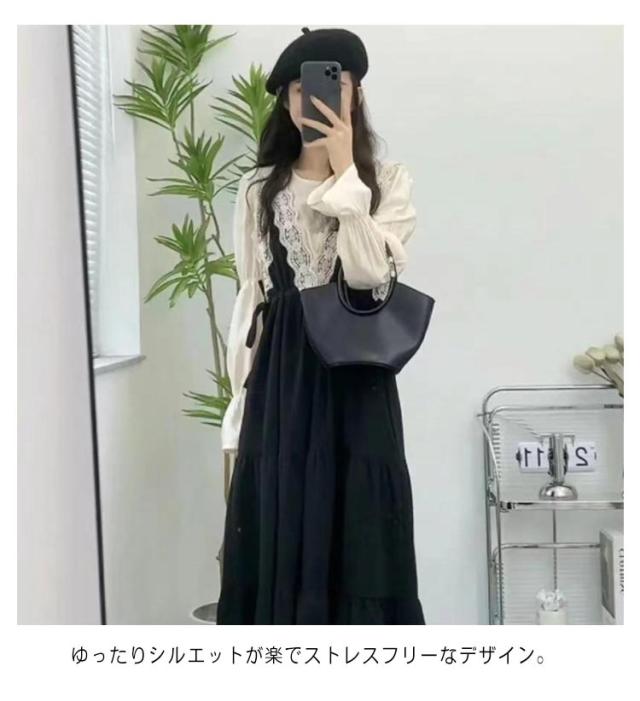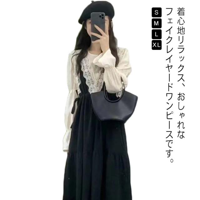 フェイクレイヤード キャミソールワンピース 長袖 ロングワンピース レース付き キャミソールドレス Aライン ワンピース フレアワンピース ハイウェスト エレガント レース 切り替え 秋 冬 S M L XL