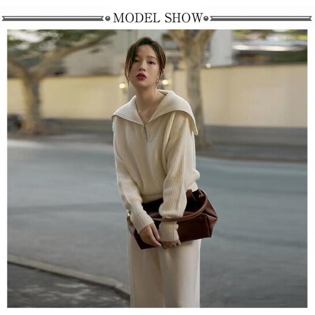 | 襟で魅せる♪トレンドのセーラーカラーニット。 ジップを大きく開ければ、後ろ姿はセーラーカラーのような大きな襟に、ジップを閉じればハイネックに、アレンジできるセラーカラーニット。 ふんわりとした柔らかなニット編地が心地よく、チクチクしない。 ざっくりとした程よいボリューム感が暖かな1枚。 | |