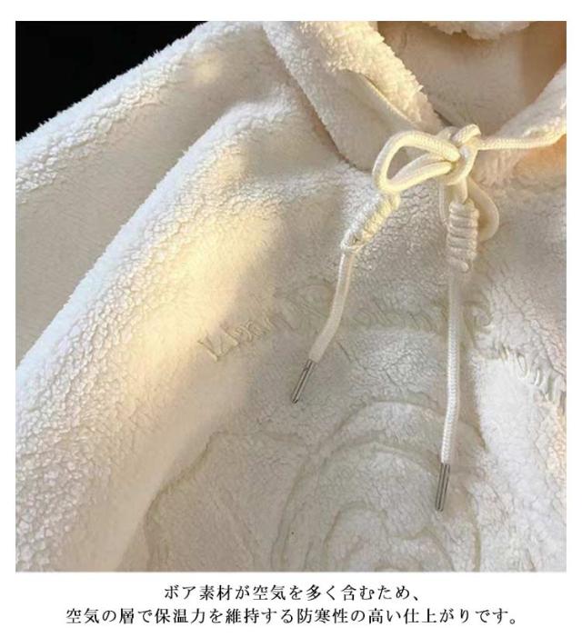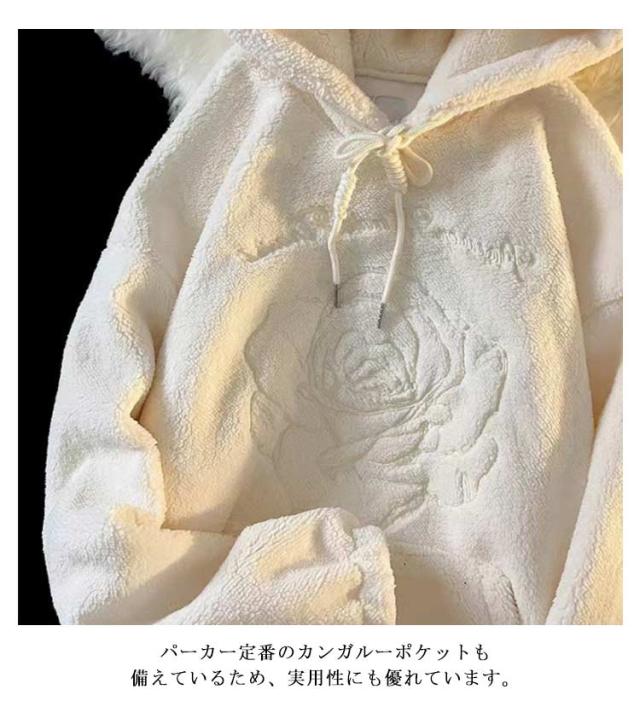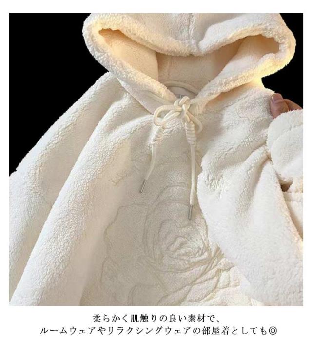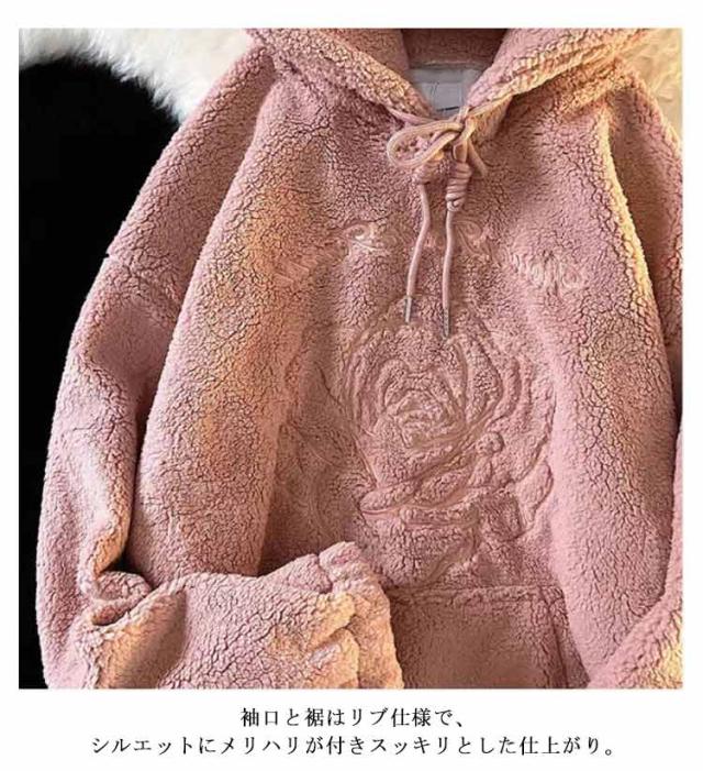 【送料無料】ボアフリース パーカー プルオーバー 花柄 刺? レディース フーディー もこもこ ふわふわ ボア フリース 花刺繍 ゆったり オーバーサイズ 秋 冬 ボアフリースパーカー 厚手 学生 女子 無地 可愛い