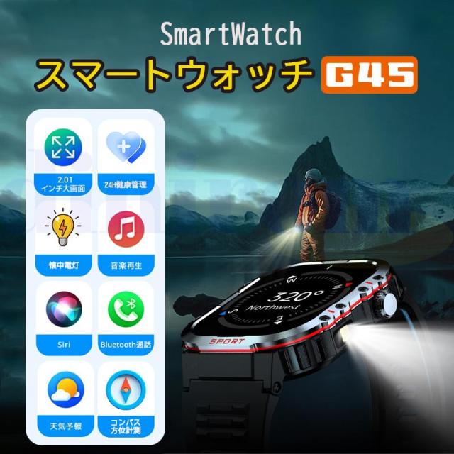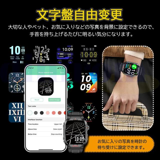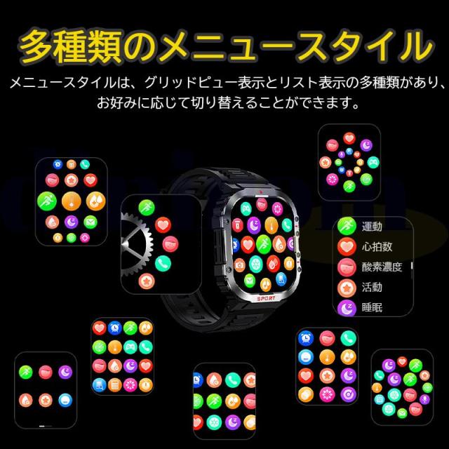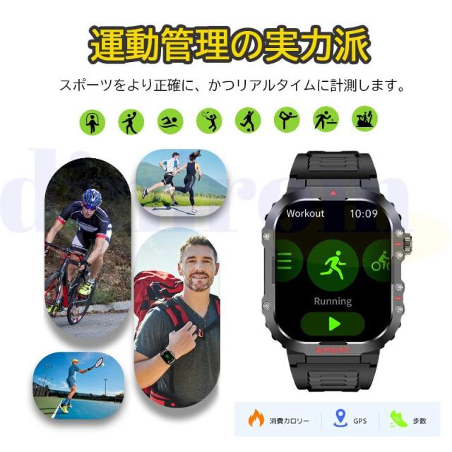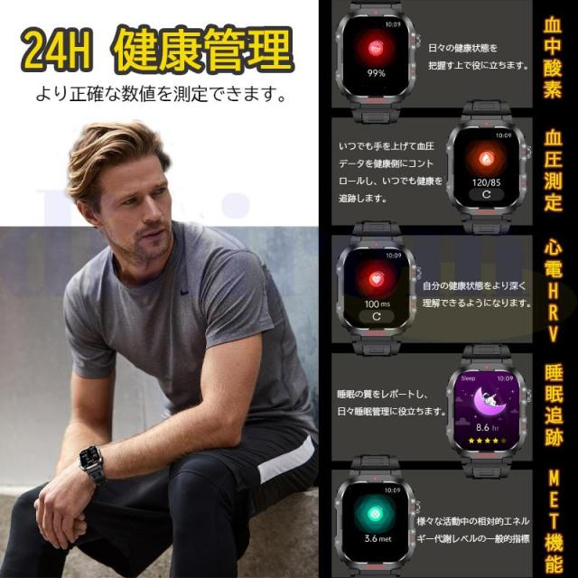【IP68防塵防水&軍用規格スマートウォッチ】このスマートウォッチは業界最高水準のIP68防塵防水機能を実現、水や汗による故障の心配なく利用できます。本スポーツウォッチは屋外や、粉塵の舞う製造工場で使用することができ、防塵防滴、耐衝撃、耐高温/耐低温性能などの頑丈設計を行い、多くの軍用標準テストに合格することができます。また、高精細で美しい色を表現できる2.01インチタッチディスプレイを搭載し、視認性に優れた高解像度大画面を採用され、画質がより鮮明になり、より高精度な大画面で文字を表示されます。例のない快適な視覚感と優れた操作感をもたらします。