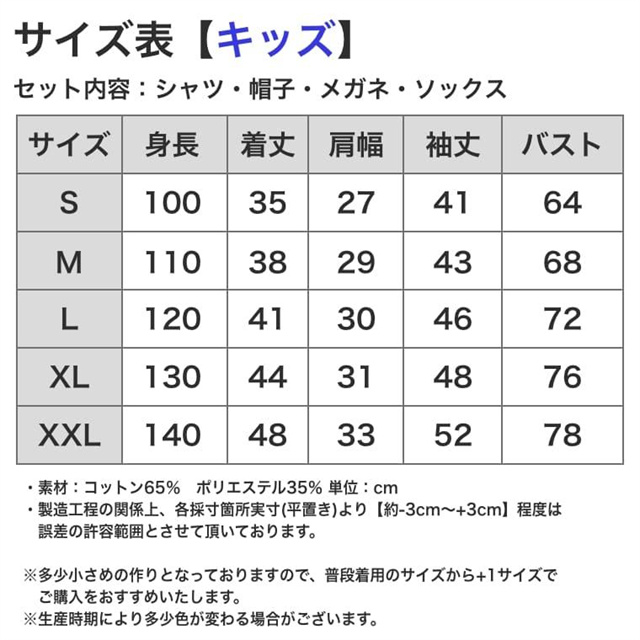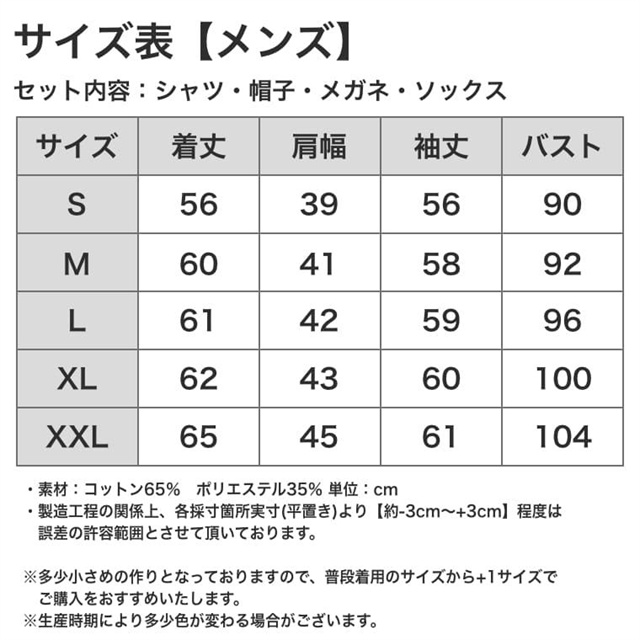 セット内容:Tシャツ、帽子、眼鏡、ソックス
