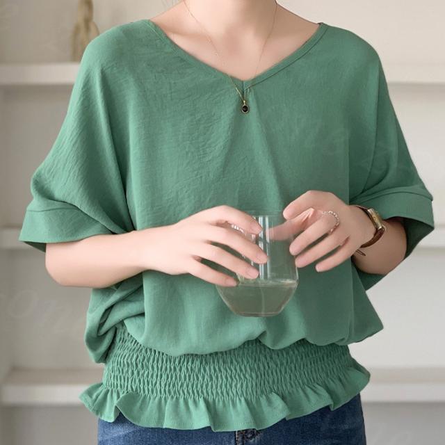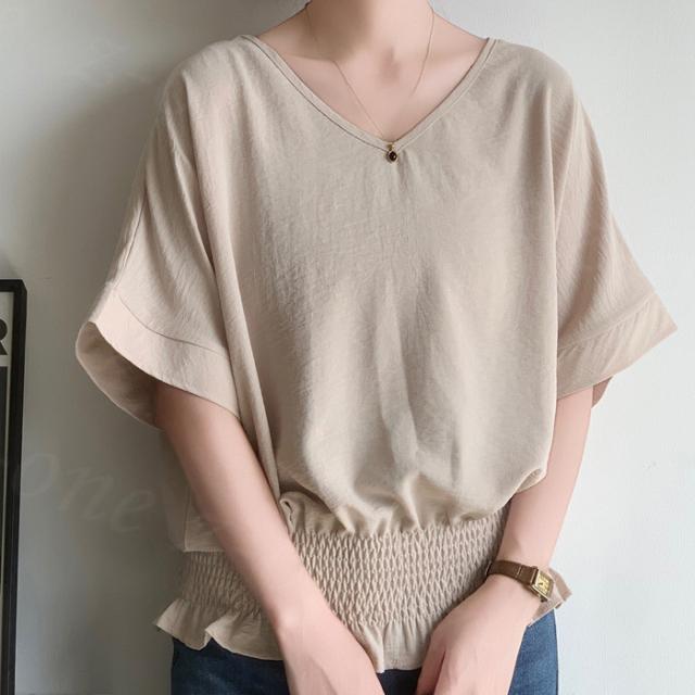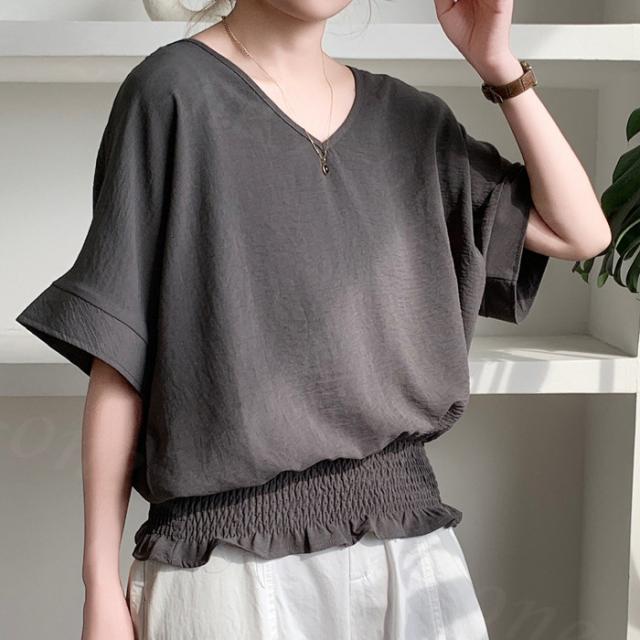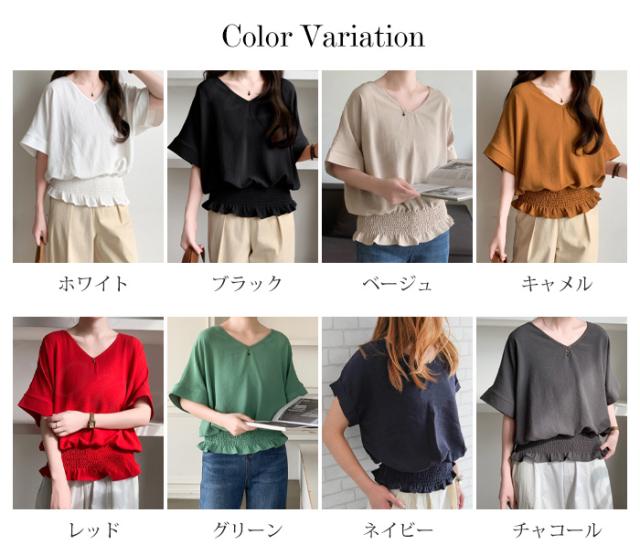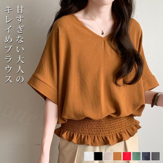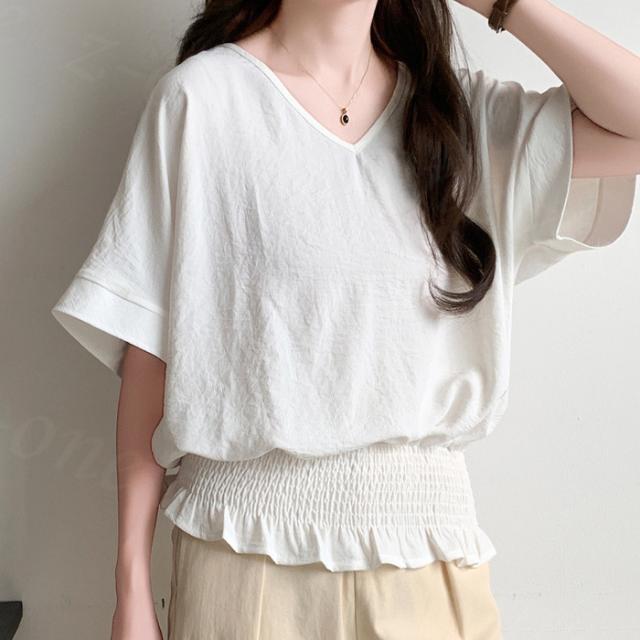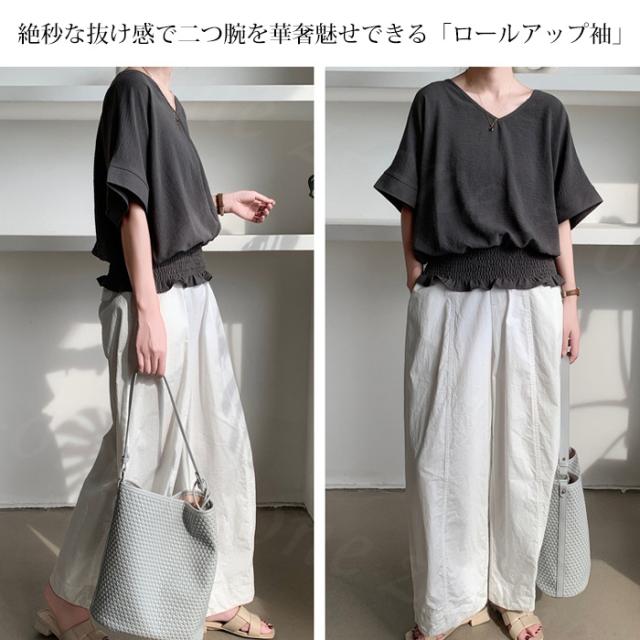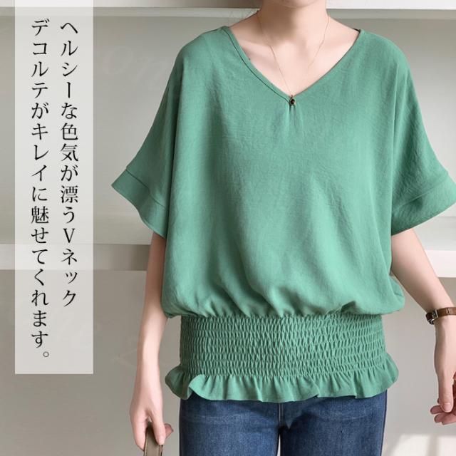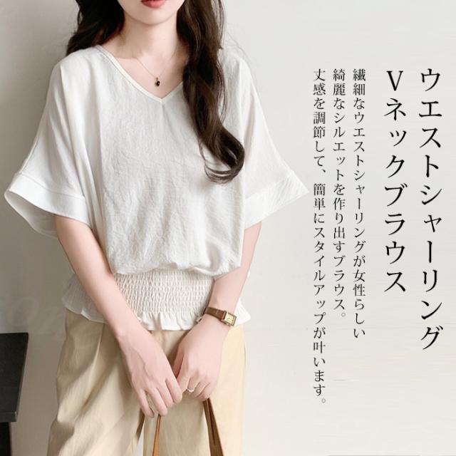 ブラウス リネン ウエストシャーリング 新作 トップス シャーリングブラウス レディース vネックブラウス 半袖 夏 vネック サマーブラウス 夏ブラウス シャーリングブラウス半袖 送料無料 入学式 入園式