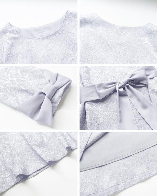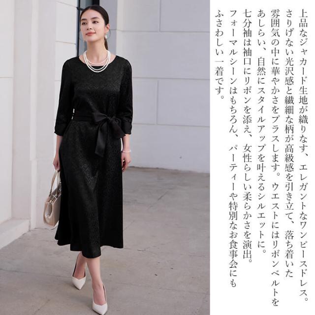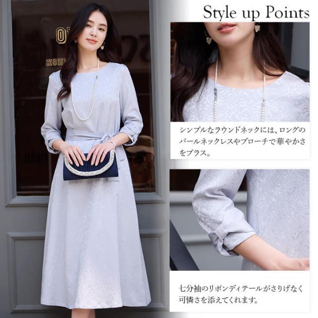 七分袖は袖口にリボンを添え、女性らしい柔らかさを演出、フォーマルシーンや特別な日にふさわしい一着です。