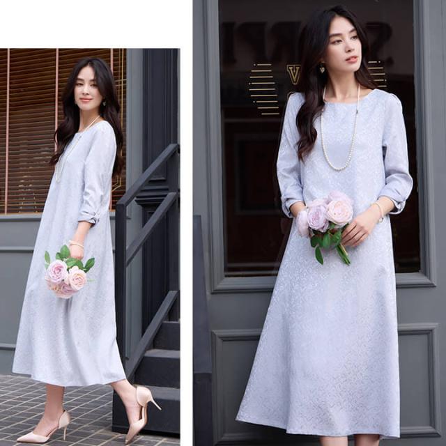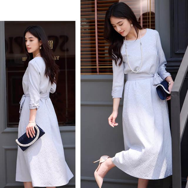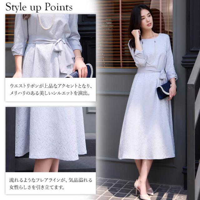 ワンピースドレス ロングドレス レディース パーティードレス ドレス セレモニードレス ジャカード生地 ロング丈 マキシ丈 ウエストリボン 袖口 フェミニン ラウンドネック 七分袖 長袖 結婚式 謝恩会 発表会 食事会 上品 きれいめ すっきり 軽やか 着心地