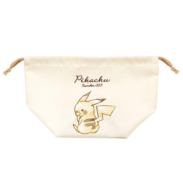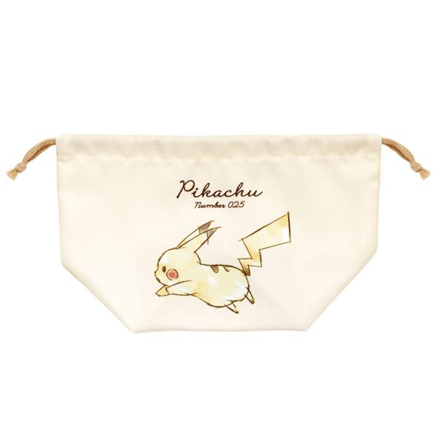 やさしいクリームカラーに、水彩タッチのピカチュウが映えるランチ巾着。