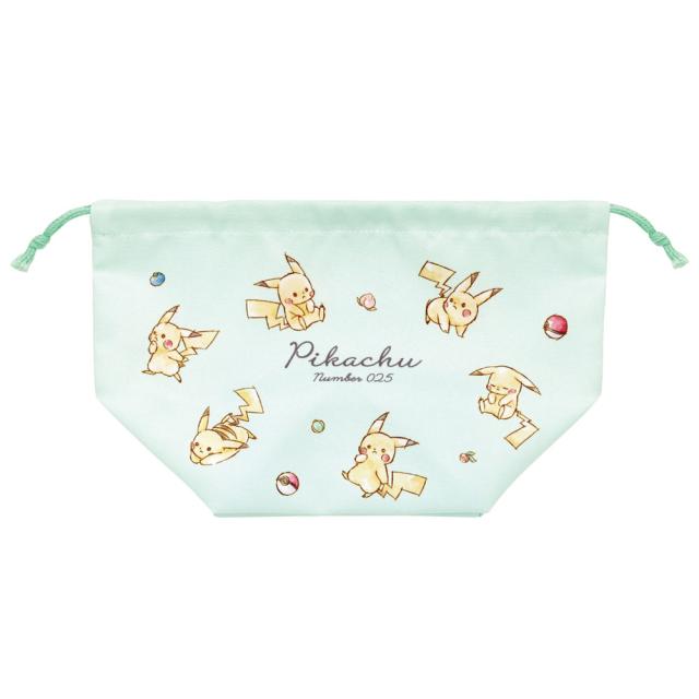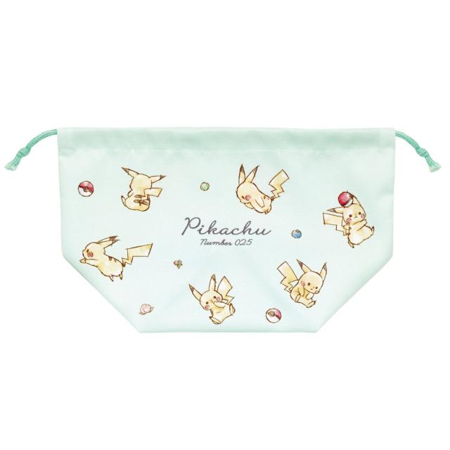 パステルミントのやさしいカラーに、いろんな表情のピカチュウがちりばめられたランチ巾着。