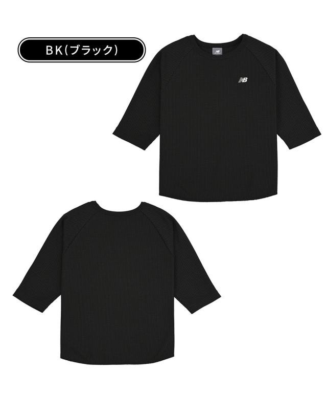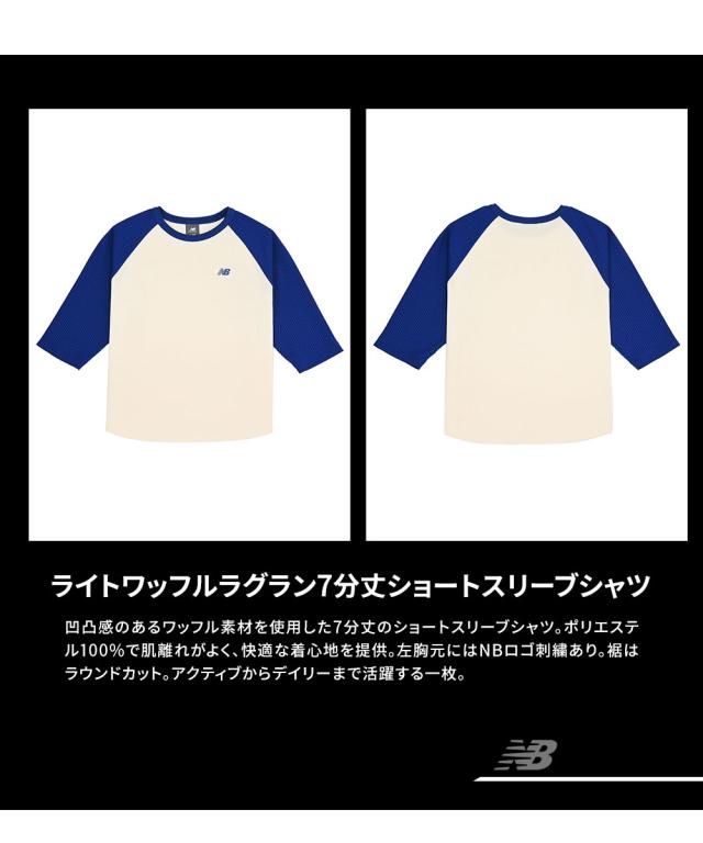 凹凸感のあるワッフル素材を使用した7分丈のショートスリーブシャツ。ポリエステル100%で肌離れがよく、快適な着心地を提供。左胸元にはNBロゴ刺繍あり。裾はラウンドカット。アクティブからデイリーまで活躍する一枚。